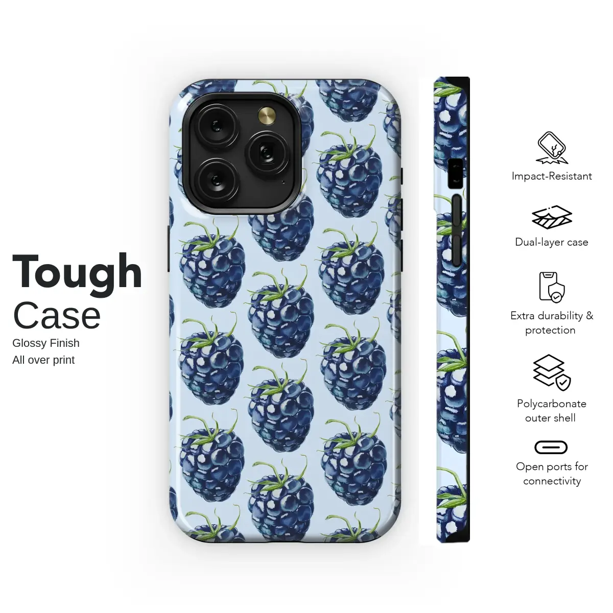 Adorn your accessories with this charming watercolor blackberry design. Featuring a repeating pattern of juicy, ripe berries set against a soft sky-blue background, this botanical art brings a touch of summer garden charm and a cottagecore aesthetic to your daily life. The detailed illustration captures the vibrant blues and purples of the fruit, making it a perfect choice for any nature lover.