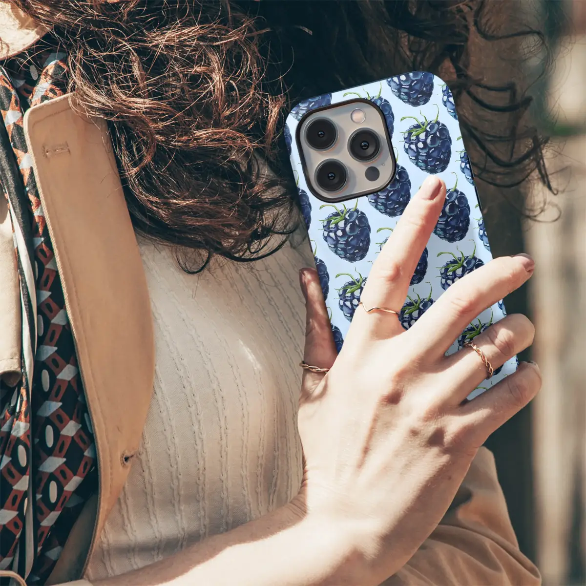 Adorn your accessories with this charming watercolor blackberry design. Featuring a repeating pattern of juicy, ripe berries set against a soft sky-blue background, this botanical art brings a touch of summer garden charm and a cottagecore aesthetic to your daily life. The detailed illustration captures the vibrant blues and purples of the fruit, making it a perfect choice for any nature lover.