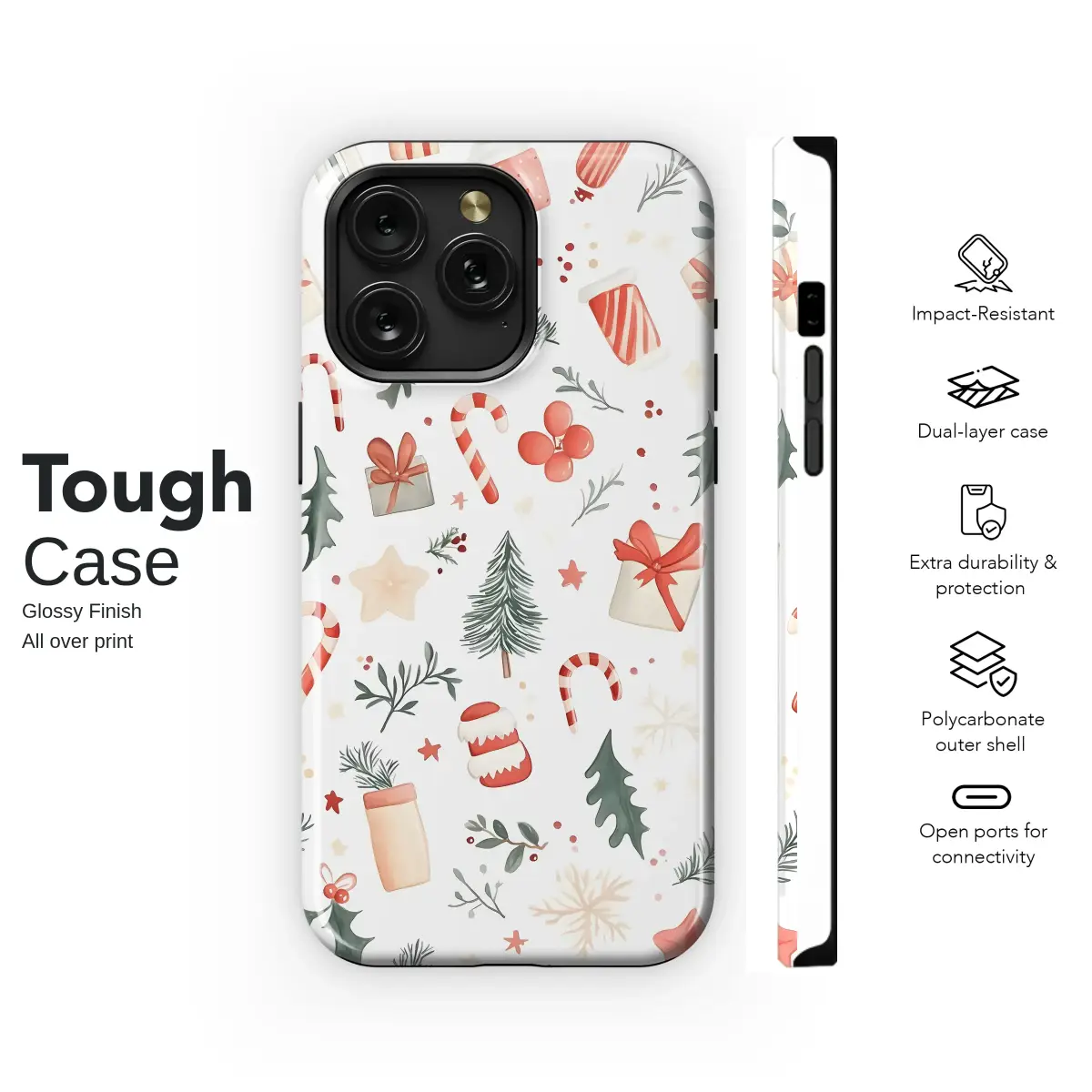 Embrace the holiday spirit with this charming watercolor design. The pattern is filled with whimsical Christmas illustrations, including sweet candy canes, fresh pine branches, neatly wrapped gifts, and touches of holly, creating a cozy and festive feel for the season.