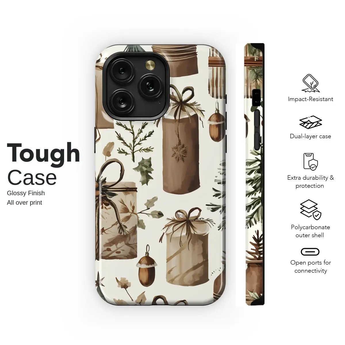 Embrace the holiday spirit with this charming watercolor Christmas pattern. This design features a cozy assortment of rustic, beautifully wrapped gifts, festive pine trees, and delicate winter botanicals like holly and pinecones. The warm, earthy color palette creates a sophisticated and natural holiday aesthetic, perfect for anyone who loves a cottagecore or woodland-inspired winter vibe.