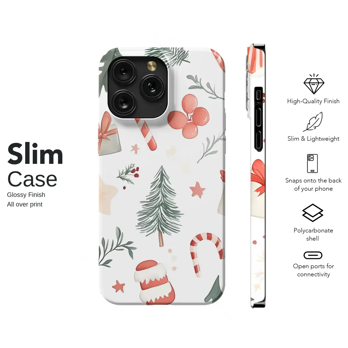 Embrace the holiday spirit with this charming watercolor Christmas phone case. Its festive pattern features classic yuletide illustrations like candy canes, pine trees, and gift boxes, perfect for adding a touch of winter cheer to your device. This protective and stylish cover showcases a whimsical, hand-painted aesthetic, making it a unique accessory for the holiday season. The high-quality printing captures the delicate details and soft colors of the original artwork. Key Features: • Durable polycarbonate outer shell • Flexible TPU inner liner for shock absorption • High-quality UV printing with a glossy finish • Protects from scratches, dust, and daily wear • Clear, open ports for connectivity • Compatible with wireless charging This case is a wonderful stocking stuffer or holiday gift for friends, family, or anyone who loves a cozy, festive vibe. Available for most popular iPhone, Samsung Galaxy, and Google Pixel models.