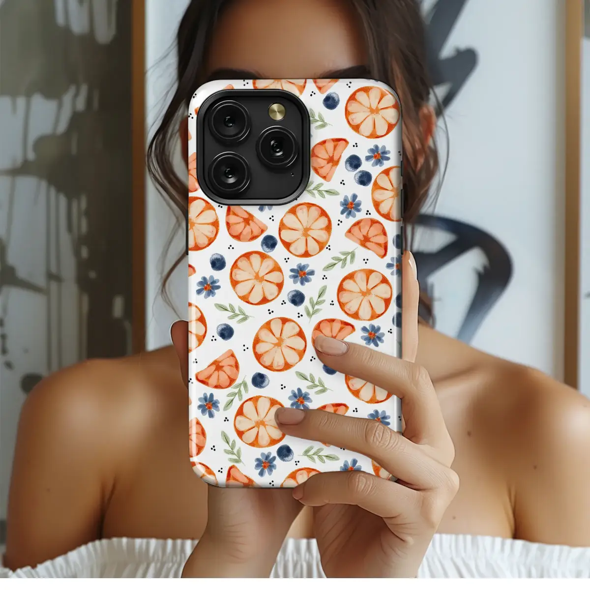 Step into a sun-drenched orchard with every glance at this delightful design, a perfect slice of summer to carry with you. Imagine the sweet, zesty scent of freshly picked oranges mingling with the juicy burst of wild blueberries on a warm, golden afternoon. This artwork captures that perfect, carefree moment, rendered in a soft, whimsical watercolor style that feels both charming and refreshingly chic. Each vibrant orange slice and deep indigo berry is lovingly illustrated, scattered amongst delicate blue wildflowers and tender green leaves, creating a seamless pattern that dances with life and color. It's a beautiful celebration of nature's simple pleasures, a botanical dream designed to bring a little pocket of sunshine and cottagecore charm to your daily routine. Let this beautiful hand-painted illustration adorn your favorite accessory, transforming an everyday essential into a unique piece of wearable art that tells a story. It’s more than just a pretty pattern; it’s an instant mood-lifter, a small, constant reminder of idyllic summer days, and the perfect artistic expression for anyone who loves a touch of handcrafted, nature-inspired beauty. This fruit and floral design is ideal for adding a pop of cheerful color and personality, making your style statement as unique and vibrant as you are. A wonderful aesthetic gift for her or any nature lover in your life.