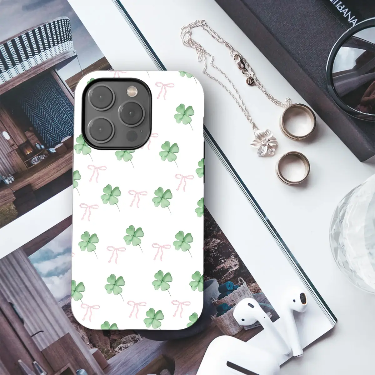 Embrace a touch of luck with this charming design featuring a delightful pattern of watercolor four-leaf clovers and sweet pink bows. The soft, preppy aesthetic creates a whimsical and stylish look, perfect for those who love a coquette-inspired or lucky charm theme.