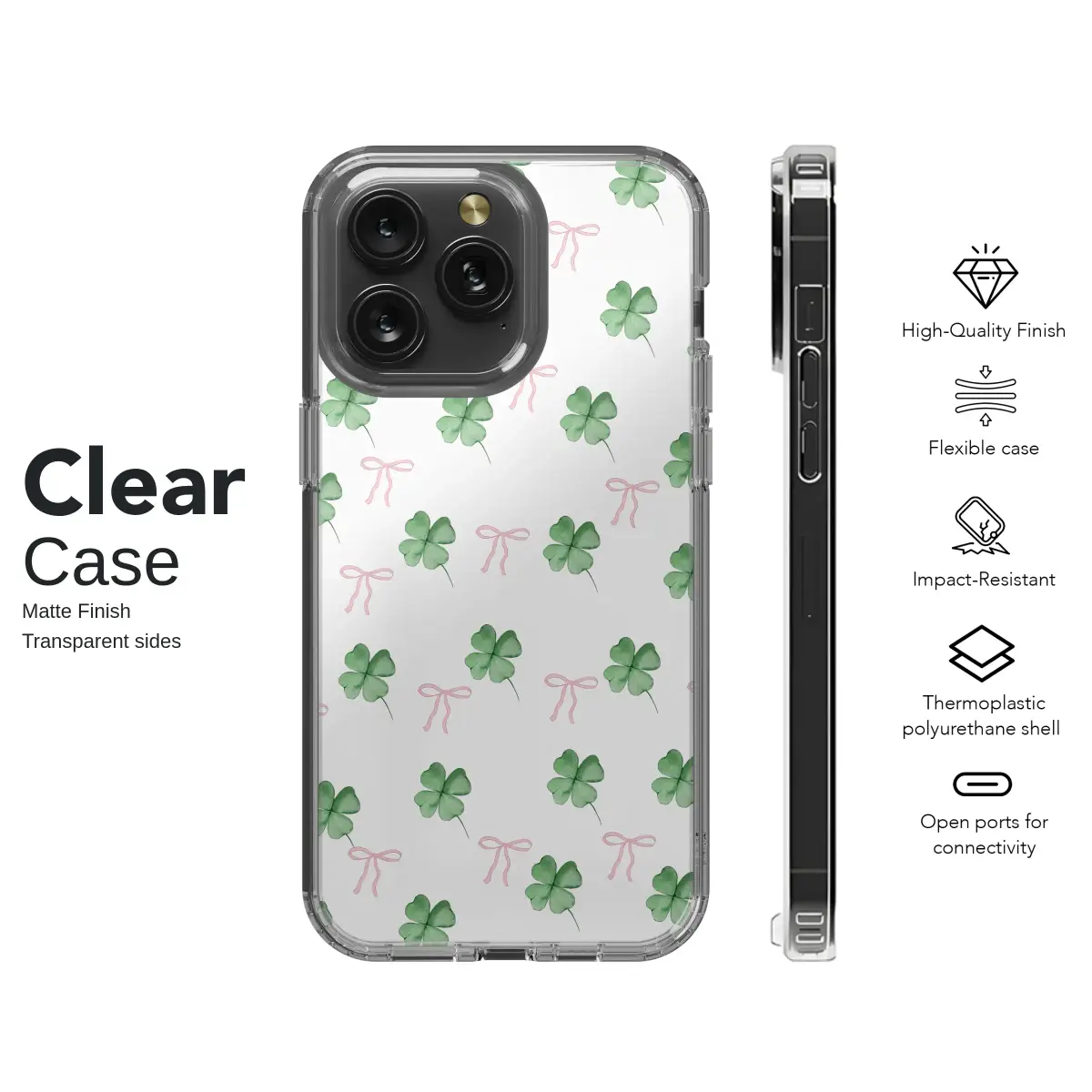 Embrace a touch of luck with this charming design featuring a delightful pattern of watercolor four-leaf clovers and sweet pink bows. The soft, preppy aesthetic creates a whimsical and stylish look, perfect for those who love a coquette-inspired or lucky charm theme.