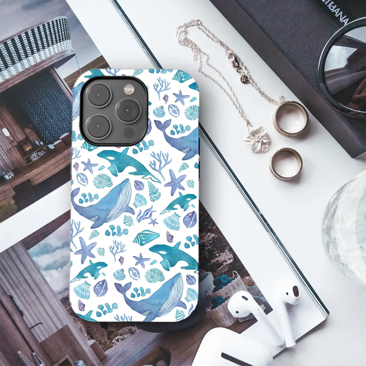 Dive into a world of serene beauty and carry the ocean's song with you. Our exclusive design captures the breathtaking dance of marine life, rendered in the soft, flowing style of watercolor. Imagine majestic humpback whales and sleek, powerful orcas swimming through a tranquil sea of brilliant turquoise, cerulean, and deep indigo. This captivating pattern is a vibrant underwater tapestry, where every glance reveals a new treasure. Delicate starfish cling to waving coral, while an array of intricately detailed seashells, from spiraled conchs to fanned scallops, are scattered like jewels across the pristine white background. The fluid, dreamy quality of the watercolor art evokes a sense of calm and wonder, turning your everyday accessory into a piece of portable art. It’s a perfect expression of love for the sea, ideal for any marine biology enthusiast, seasoned beachcomber, or soul who feels the pull of the tides. Let this beautiful nautical pattern transport you to a sun-dappled reef, wrapping your daily essentials in the soul-soothing embrace of the deep blue. This design is more than just a pattern; it’s a small escape to the coast, a perfect gift for anyone who dreams in shades of ocean.