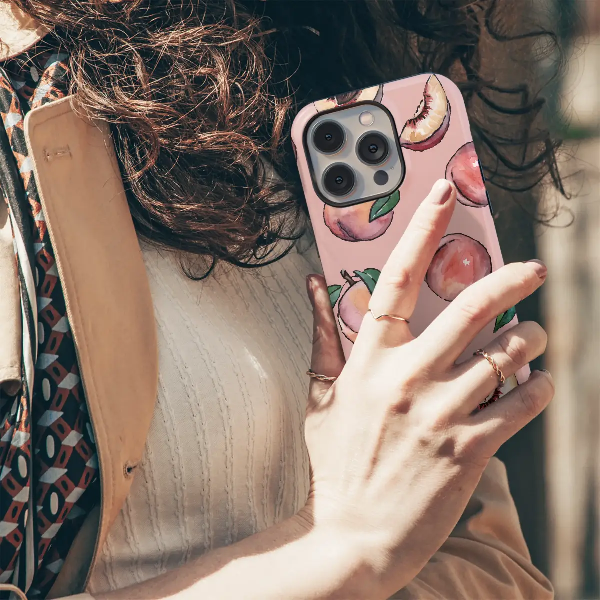 Showcase your style with this charming watercolor peach pattern. The artistic design features beautifully hand-painted peaches, complete with slices and green leaves, set against a soft, dusty pink background. It's a fresh, fruity, and vibrant look perfect for capturing a sweet, summery vibe all year round.