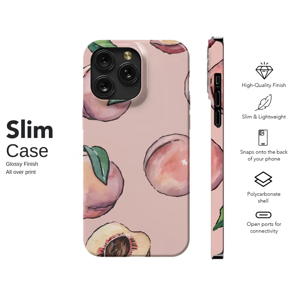 Showcase your style with this charming watercolor peach pattern. The artistic design features beautifully hand-painted peaches, complete with slices and green leaves, set against a soft, dusty pink background. It's a fresh, fruity, and vibrant look perfect for capturing a sweet, summery vibe all year round.