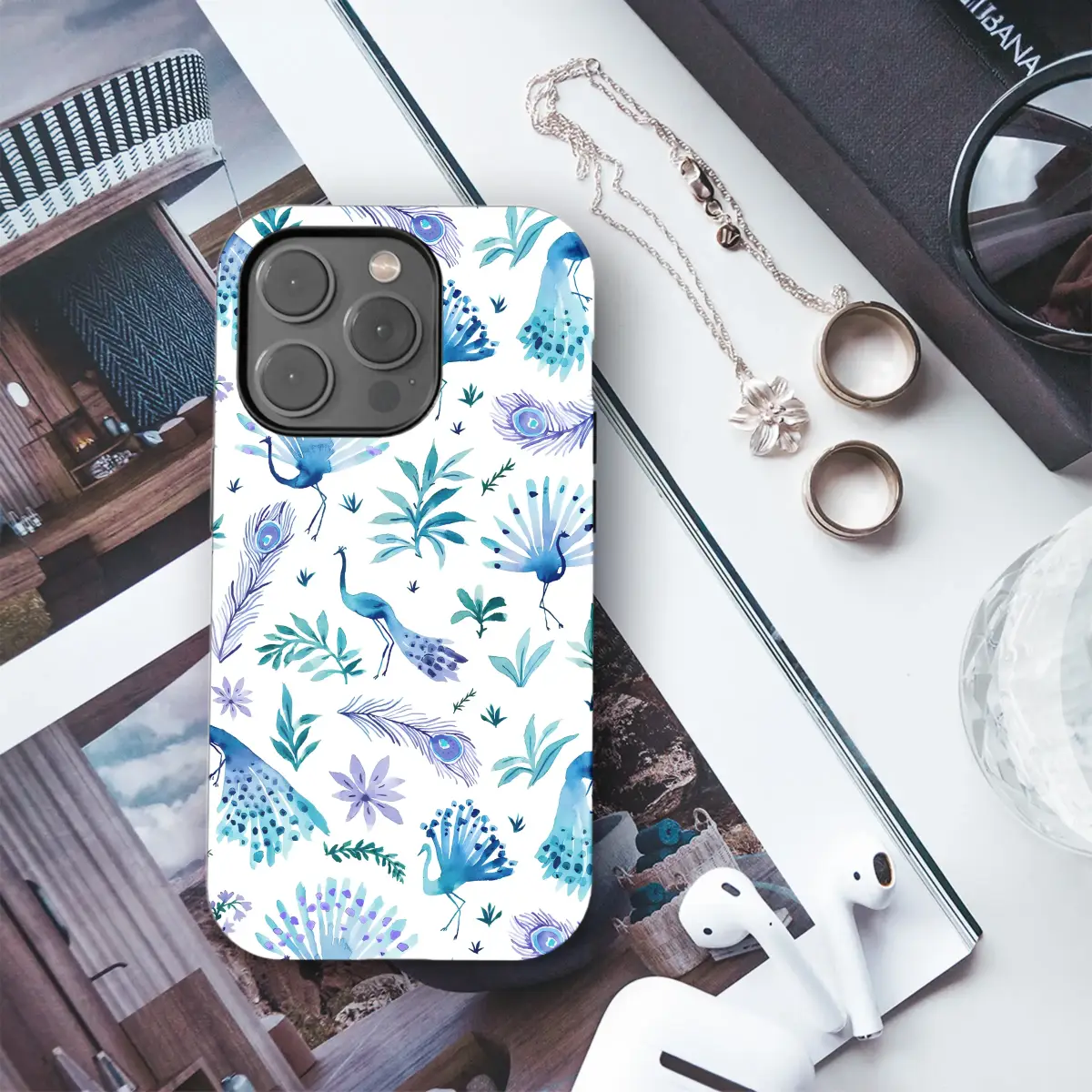 Adorn your accessories with this elegant watercolor design featuring a stunning array of peacocks. Rendered in a beautiful palette of blues, teals, and soft purples, this artistic pattern showcases majestic birds, delicate feathers, and botanical elements against a crisp white background. The painterly, whimsical style adds a touch of nature-inspired artistry and sophistication to your everyday essentials.
