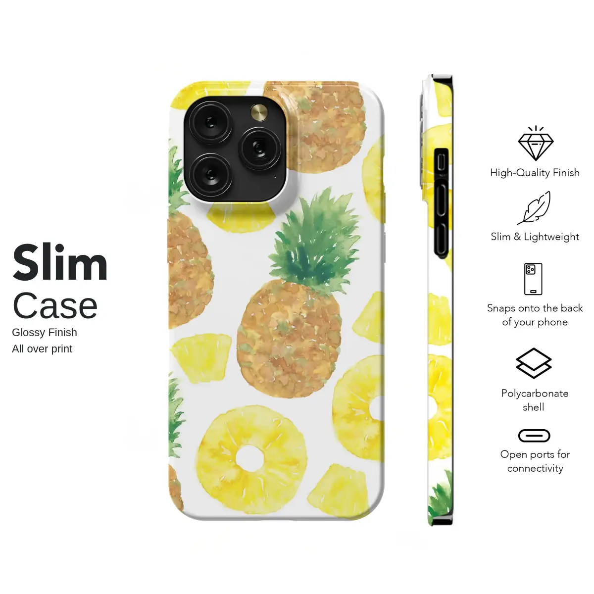 Embrace the feel of summer with this vibrant watercolor pineapple design. The charming pattern features beautifully painted whole pineapples, juicy slices, and sweet chunks scattered across a crisp white background. The artistic, hand-painted style brings a fresh and tropical feel, perfect for anyone who loves bright, fruity aesthetics.