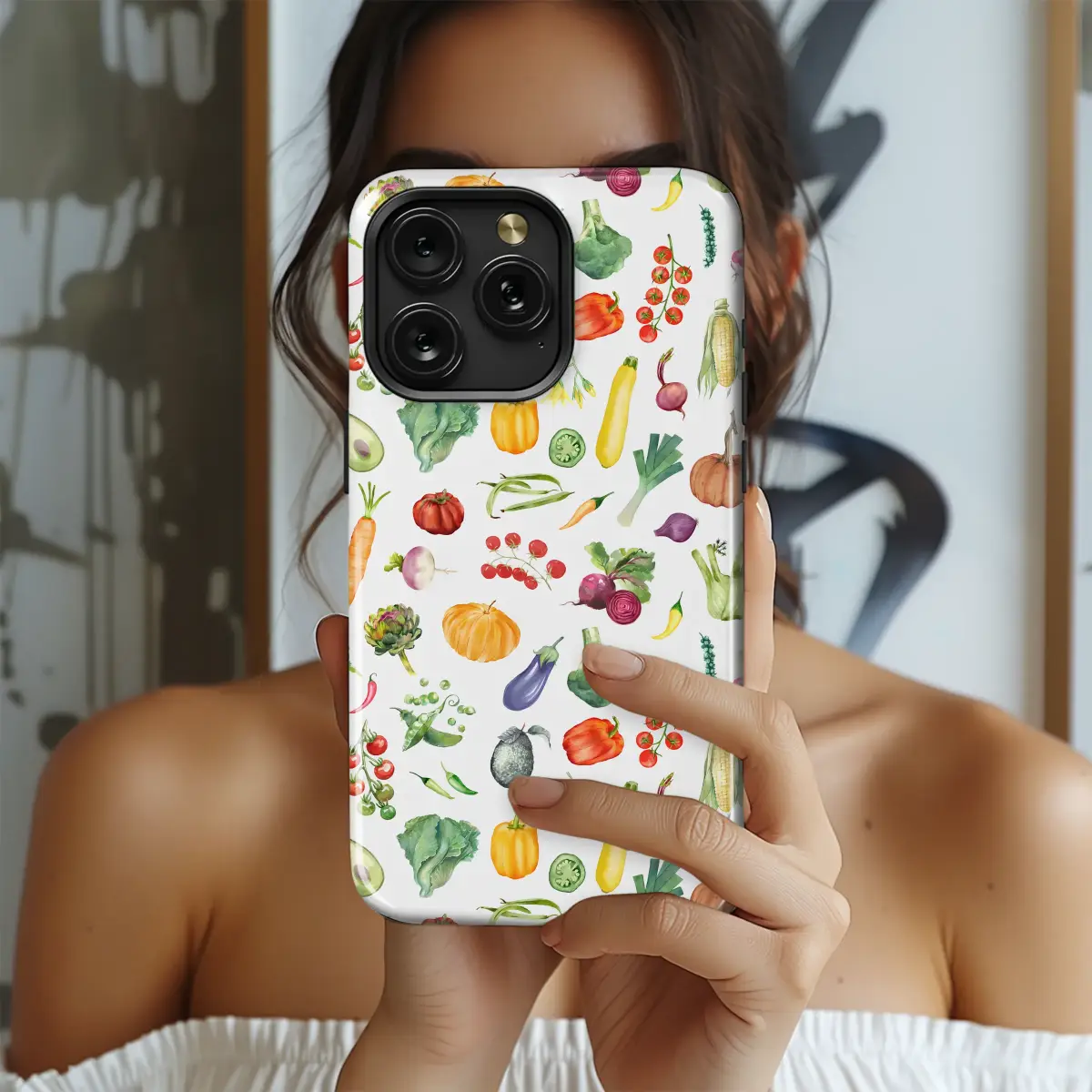 Showcase your love for fresh food with this vibrant watercolor vegetable design. This charming pattern features a delightful assortment of garden-fresh produce, including plump pumpkins, ripe cherry tomatoes, crisp bell peppers, and lush avocados. All are beautifully rendered in a detailed, artistic style, capturing the essence of a bountiful farmer's market harvest and adding a touch of rustic charm.
