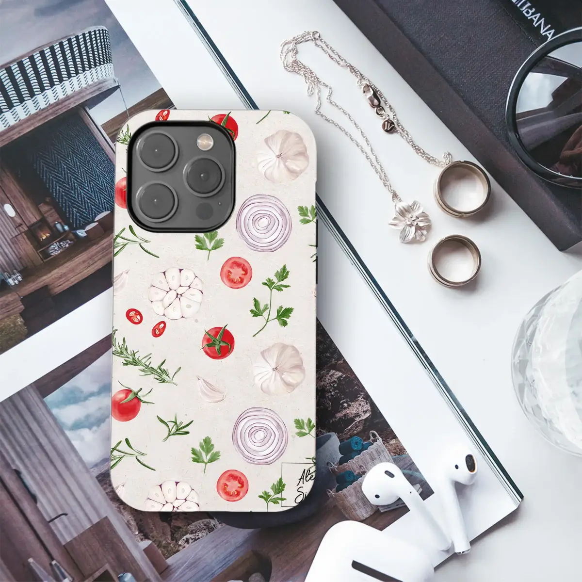 Showcase your love for fresh ingredients with this charming Italian kitchen-inspired design. This pattern features a delightful watercolor illustration of savory vegetables and aromatic herbs, including ripe cherry tomatoes, whole garlic bulbs, sliced red onion, and sprigs of fresh rosemary and parsley. The illustrations are set against a rustic, textured background, creating a warm and culinary aesthetic perfect for any foodie.