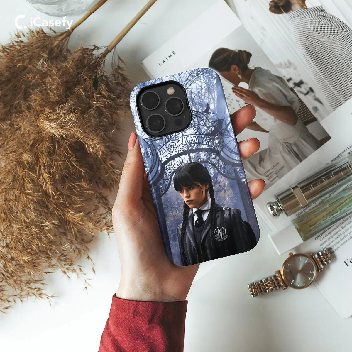 Step into the macabre charm of Wednesday Addams and Enid Ophelia with this hauntingly delightful phone case featuring the duo gazing out of a window. Inspired by their gothic allure and dark humor, this case captures the essence of their iconic personalities. Carry a touch of the Addams Family's eccentricity with you wherever you go and let your device reflect your love for all things spooky and peculiar with this captivating accessory.