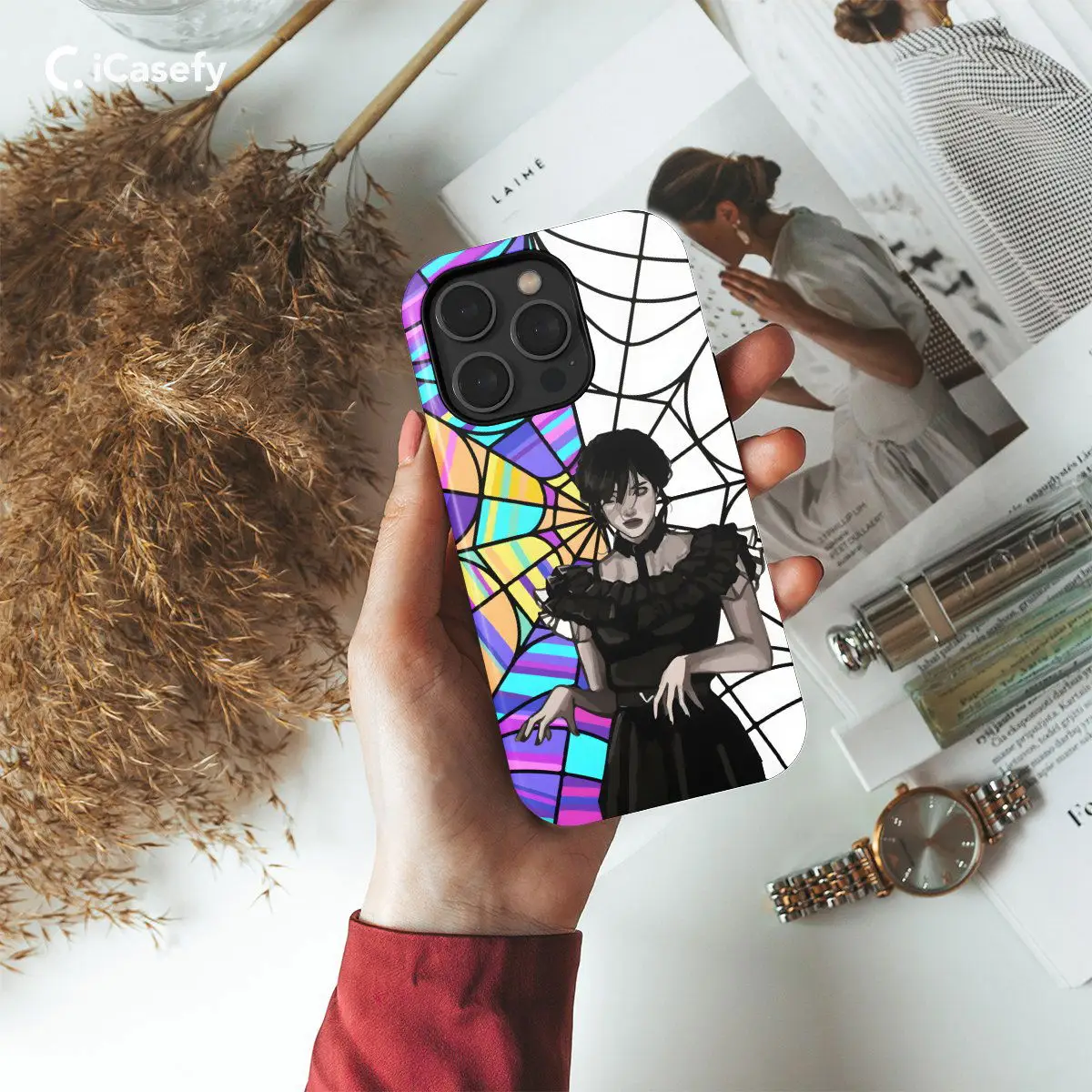 Embrace the mysterious charm of Wednesday Addams and Enid Ophelia with this haunting phone case featuring the duo gazing out of a window. With their signature gothic style and enigmatic presence, Wednesday and Enid captivate with their unique allure. Carry a touch of dark whimsy with you wherever you go and let your device reflect your appreciation for all things delightfully macabre with this bewitching accessory.