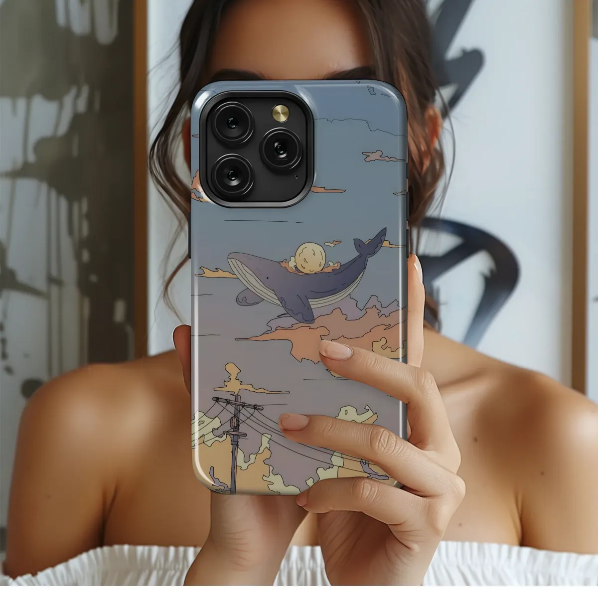 Embrace the whimsical with this dreamy design featuring a whale soaring through a pastel sky, carrying a miniature moon. This artistic print is perfect for adding a touch of magic to your everyday life. The calming color palette and unique imagery create a soothing and captivating aesthetic, transforming your accessory into a statement piece that reflects your individuality and appreciation for art. The intricate details and soft lines make this design incredibly versatile, ideal for expressing a calm, imaginative, and artistic spirit. This enchanting illustration is printed with high-quality inks, ensuring vibrant, long-lasting colors that will maintain their charm. Its eye-catching design is guaranteed to spark conversations and bring a smile to your face, making it a great gift for yourself or a loved one who appreciates art and unique style. Transform your personal item into a canvas for artistic expression with this captivating and imaginative design. This piece is a testament to beauty found in the unusual, making it an exceptional addition to any collection of artistic expressions. Bring a touch of the extraordinary to your daily routine with this delightful design.