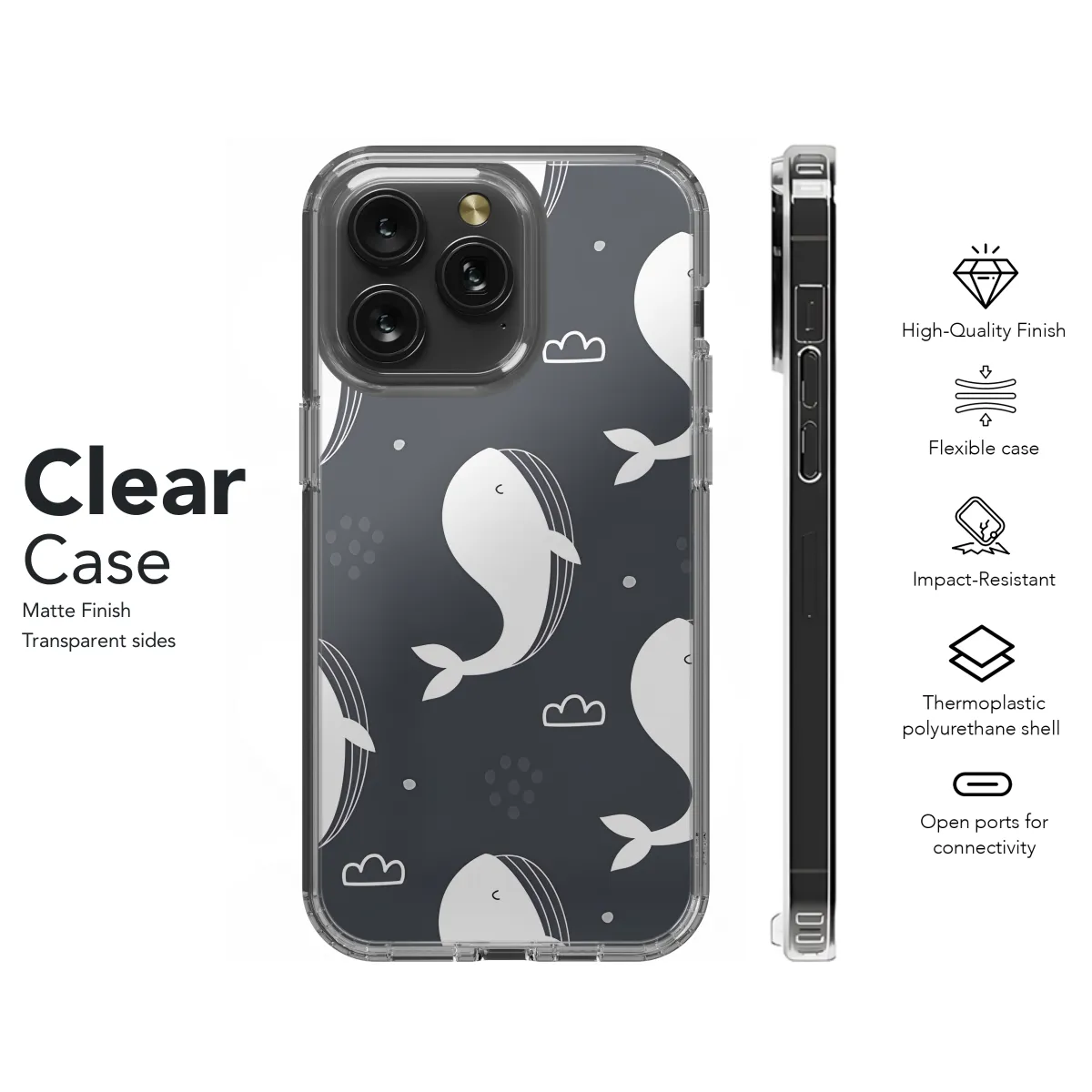 **Unique and Protective Phone Case for Your Precious Device** Transform your phone into a marine masterpiece with our exquisite Whale Phone Case. This case not only provides exceptional protection but also adds a touch of aquatic charm to your everyday gadget. Designed with meticulous precision, our case perfectly fits your iPhone, Samsung, or Pixel device, ensuring a snug and secure fit. The durable material safeguards your phone from bumps, drops, and accidental scratches, preserving its pristine condition. But what truly sets our case apart is its captivating whale silhouette. The vibrant colors and intricate details bring the majestic creature to life, making your phone an instant conversation starter. Whether you're a marine enthusiast or simply appreciate the beauty of nature, this case will undoubtedly turn heads.