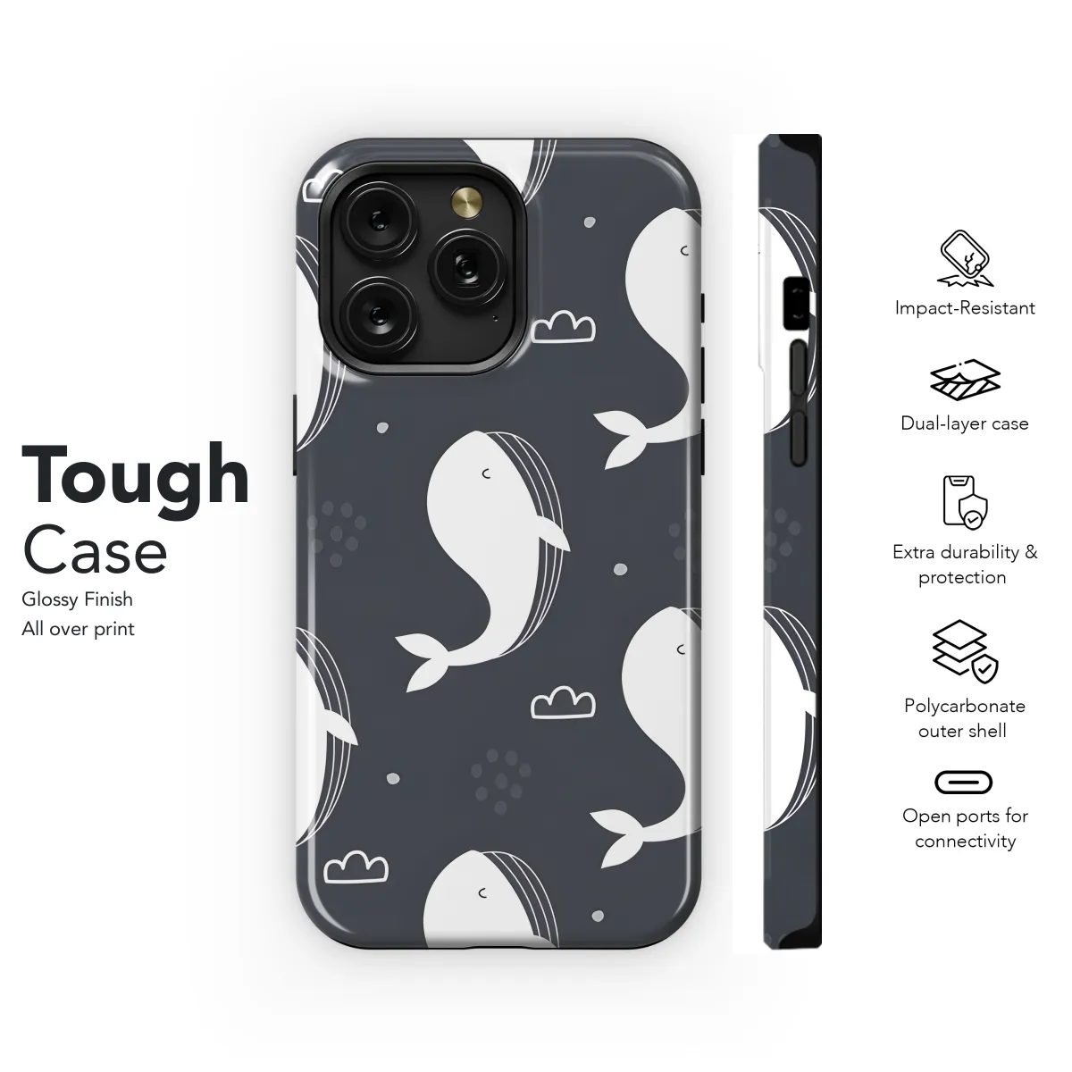 **Unique and Protective Phone Case for Your Precious Device** Transform your phone into a marine masterpiece with our exquisite Whale Phone Case. This case not only provides exceptional protection but also adds a touch of aquatic charm to your everyday gadget. Designed with meticulous precision, our case perfectly fits your iPhone, Samsung, or Pixel device, ensuring a snug and secure fit. The durable material safeguards your phone from bumps, drops, and accidental scratches, preserving its pristine condition. But what truly sets our case apart is its captivating whale silhouette. The vibrant colors and intricate details bring the majestic creature to life, making your phone an instant conversation starter. Whether you're a marine enthusiast or simply appreciate the beauty of nature, this case will undoubtedly turn heads.