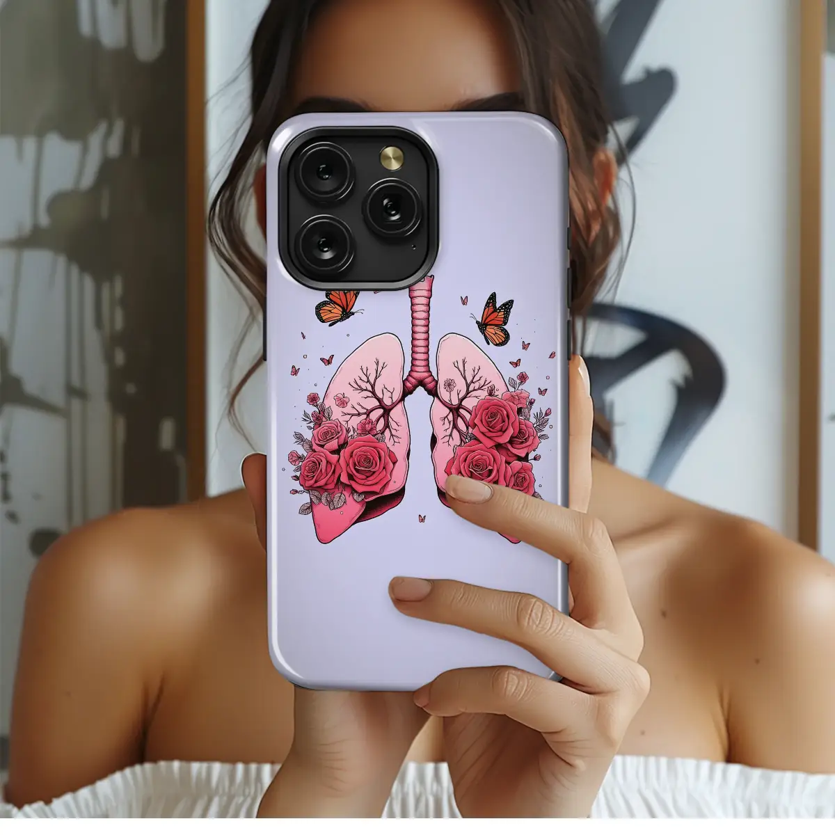 Breathe in a story of resilience and delicate beauty with this captivating anatomical art, a poetic masterpiece designed to inspire. Set against a soft lavender sky, this piece transforms the symbol of life into a blooming garden of hope. Intricate pink lungs burst forth with a lush bouquet of vibrant red and pink roses, each petal unfurling as a testament to inner strength and vitality. The bronchial passages, normally plain, are reimagined as the delicate, branching stems of a flourishing floral display—a stunning fusion of medical science and botanical wonder. Fluttering gracefully around this core of life are whimsical monarch butterflies, their orange wings carrying whispers of transformation, healing, and the freedom to take flight. This profound and aesthetic artwork is a perfect tribute for the nurse, doctor, or respiratory therapist in your life, and serves as a powerful personal emblem for anyone celebrating their own journey. Wrap your most essential daily companion in this unique, cottagecore-inspired reminder to find the bloom within every breath, a beautiful accessory that tells a story of survival and blossoming beauty.