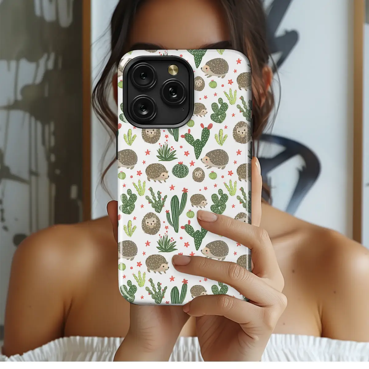 Wander into a charming desert dreamscape where the most adorable, rosy-cheeked hedgehogs explore a vibrant garden of blooming cacti and lush succulents. This whimsical pattern captures a moment of pure, sweet innocence, brought to life with a delightful, hand-painted artistic feel that gives each element a unique, storybook quality. Each tiny hedgehog, with its gentle smile and curious eyes, and every unique cactus, from the prickly pear to the round barrel, adds a touch of playful joy and endearing character. The soft, earthy color palette of gentle greens and warm browns is beautifully punctuated by cheerful pops of coral-red blossoms, creating a visually stunning and heartwarming scene. This design is a perfect expression for the nature lover, the animal enthusiast, or anyone with a soft spot for cottagecore charm blended with a unique desert aesthetic. Let this delightful artwork wrap your favorite essential in a story of friendship and unexpected beauty, turning an everyday item into a conversation starter that sparks smiles wherever you go. It’s a pocketful of happiness and a celebration of nature's cutest prickly pals, making it a thoughtful gift for a friend or a special treat to brighten your own day.