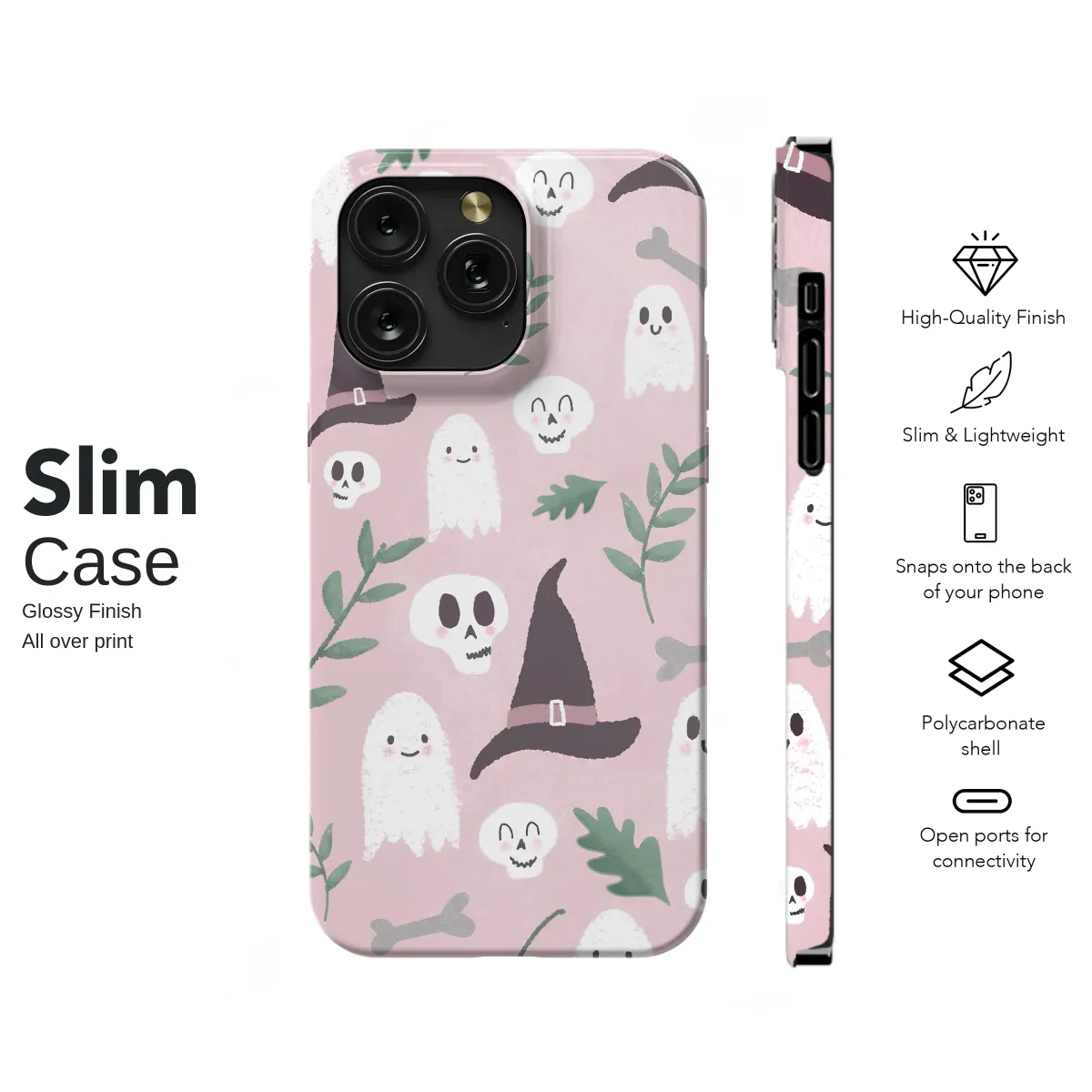 Step into an enchanting world where spooky meets sweet with this captivating design. Imagine a magical garden party under a soft autumn sky, where friendly little ghosts with rosy cheeks float playfully amidst smiling skulls and whimsical witch hats. This isn't your typical haunted scene; it's a pastel dreamscape set against a lovely blush pink canvas, blending kawaii charm with a touch of Halloween magic. Delicate green botanicals and leafy sprigs weave through the pattern, infusing a hint of earthy cottagecore serenity into the festive gathering. Each element, from the cheerful spirits to the charming witch hats and scattered bones, is rendered in a delightful hand-drawn style with a gentle, textured finish, creating a cozy and inviting vibe that feels both nostalgic and fresh. This unique artwork is perfect for those who adore the pastel goth aesthetic, cherish all things whimsical, or simply want to carry a piece of gentle spooky season magic wherever they go. Let this enchanting pattern adorn your favorite accessory, adding a pop of personality and undeniable charm to your daily essentials and turning every day into a delightful, magical adventure.