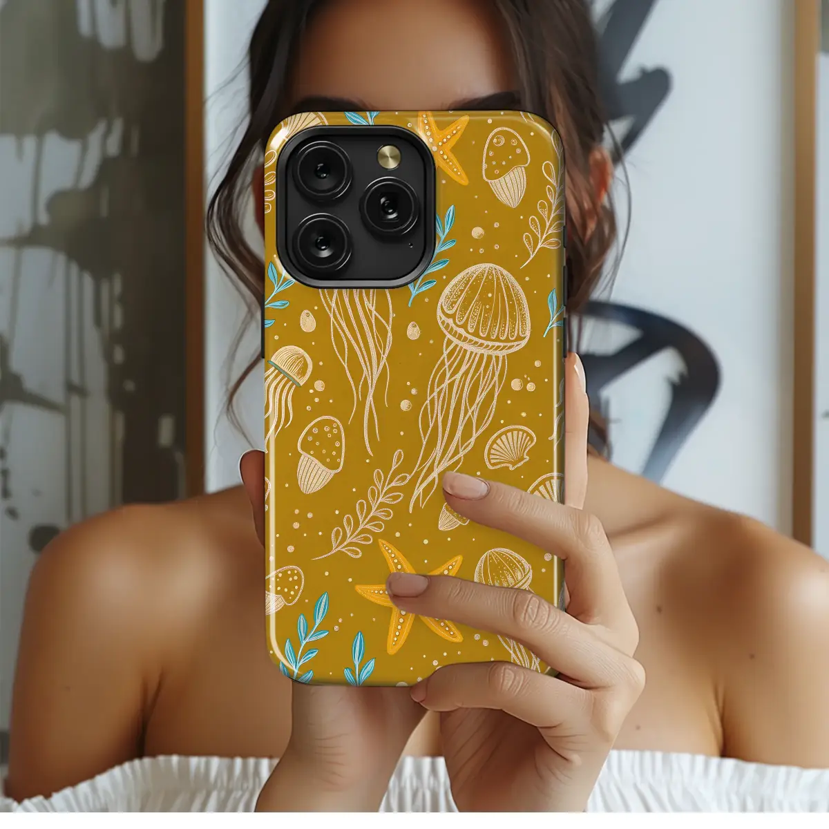Dive into a world of serene, sun-drenched beauty with this captivating artistic design, a perfect tribute to the ocean's hidden wonders. Imagine the quiet depths of a golden sea, where elegant jellyfish drift with ethereal grace, their delicate, cream-colored tentacles trailing like fine threads in a silent ballet. Bright, cheerful starfish dot the scene, adding a pop of sunny orange that feels warm and inviting, while scattered seashells whisper tales of the tide. Contrasting sprigs of cool teal seaweed sway gently, creating a beautiful and harmonious dance of warm and cool tones against the rich, earthy mustard yellow backdrop. This whimsical, bohemian-inspired pattern is a true celebration of marine life, rendered in an intricate, hand-drawn line-art style that feels both modern and timeless. The subtle textures and tiny bubble-like dots add depth and movement, making the entire composition come alive. It's for the dreamers, the ocean lovers, and those who carry a free-spirited heart. Perfect for adding a touch of artistic, coastal charm to your everyday essentials, this design transforms your favorite accessory into a unique piece of wearable art that tells a story. Let this enchanting deep-sea dance inspire a sense of calm and wonder wherever you go, a beautiful and thoughtful gift for yourself or the nature enthusiast in your life who appreciates unique, illustrated treasures.
