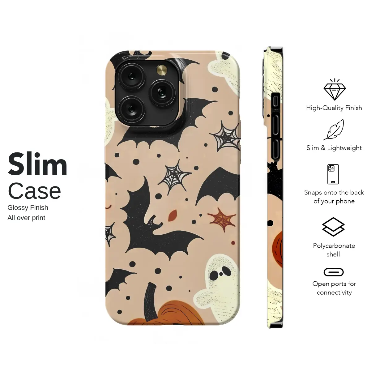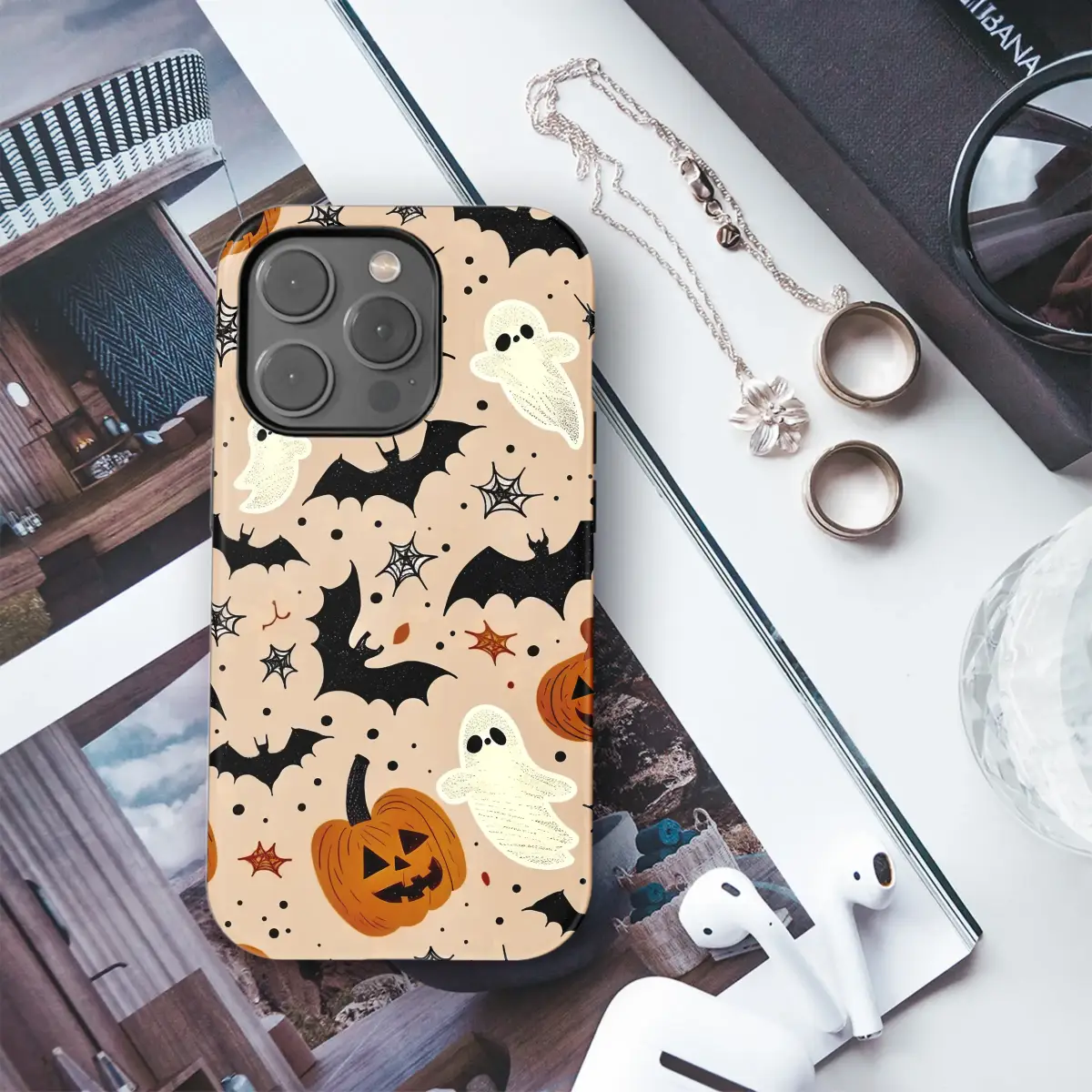 Embrace the enchanting spirit of autumn with this captivating Halloween pattern, a nostalgic celebration of all things spooky and sweet. Set against a warm, creamy beige backdrop, a whimsical gathering of classic holiday friends comes to life. Cheerful jack-o'-lanterns grin with mischievous delight, their vibrant orange hues a beacon of festive fun. Silhouetted black bats take flight, their wings spread against the imaginary twilight, while friendly little ghosts, detailed with a charming stippled texture, float playfully between them. Delicate spiderwebs and scattered dots add a touch of intricate detail, creating a dynamic and visually delightful scene. This design is more than just an illustration; it's a feeling—a throwback to crisp October nights, the rustle of fallen leaves, and the joyful anticipation of trick-or-treating. Let this charming artwork be your perfect companion, adding a touch of vintage-inspired, spooky season magic to your everyday essentials. It's the ideal way to carry the cozy, whimsical heart of Halloween with you, wherever you go, and a wonderful gift for any fellow autumn enthusiast who adores a cute, retro aesthetic.