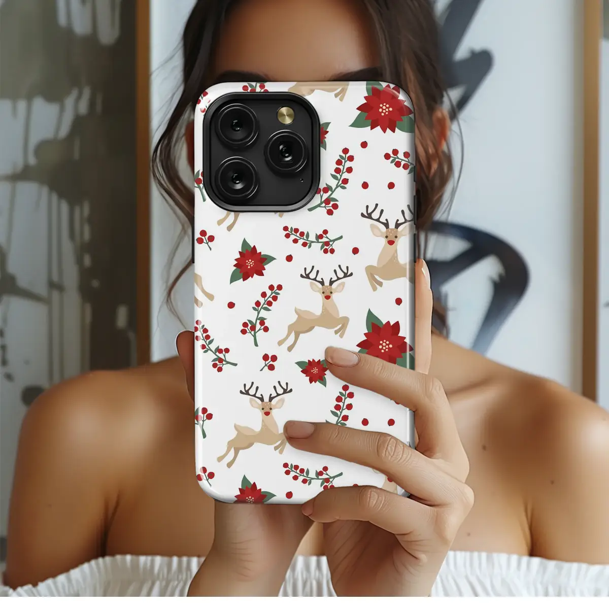 Embrace the magic of the season with this utterly charming and festive design, a whimsical dance of holiday cheer! Picture graceful reindeer, their little red noses glowing with joy, leaping playfully across a pristine, snow-white backdrop. They are joyfully surrounded by lush, ruby-red poinsettias in full bloom and delicate sprigs of winter holly berries, creating a visual symphony of classic Christmas delight. This enchanting pattern evokes the heartwarming feeling of a cozy winter cottage, sipping hot cocoa by a crackling fire. Its clean, Scandi-inspired aesthetic brings a touch of modern minimalism to a timeless woodland scene, making it a perfect piece of art for anyone who adores the holiday season. Let this delightful design wrap your everyday essentials in the spirit of a winter wonderland, a constant reminder of joyful moments and festive gatherings. It’s more than just a pattern; it’s a tiny celebration you can carry with you. A perfect stocking stuffer for a loved one or a wonderful way to treat yourself, this artwork is designed to bring a smile to your face and a dash of holiday magic to your day, every day.