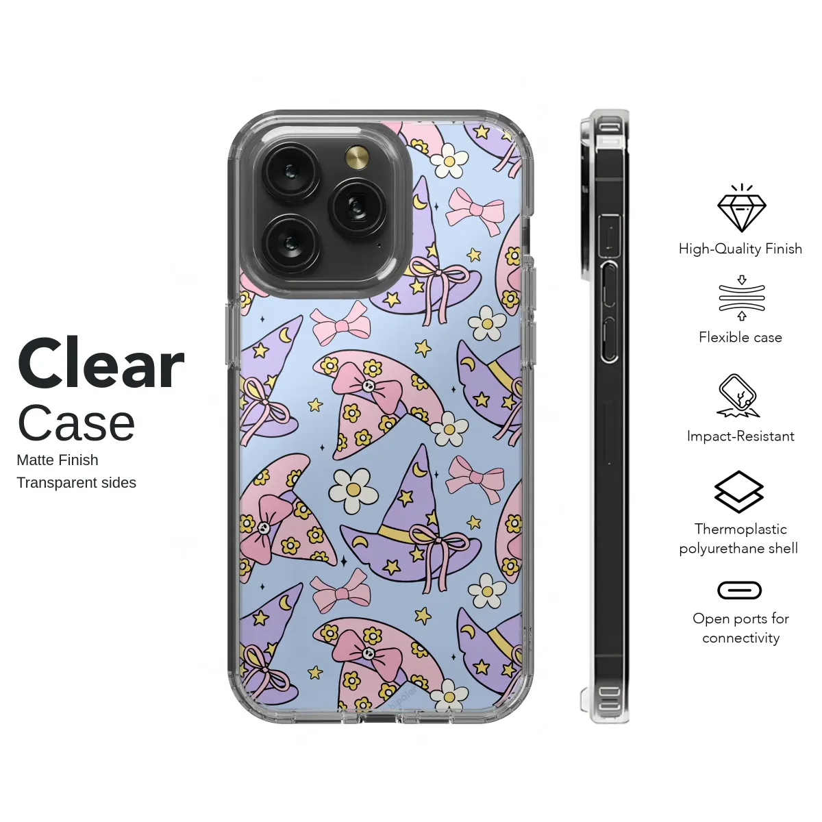 Step into a world of whimsical enchantment with this utterly charming design, a perfect little piece of everyday magic to carry with you. Imagine a dreamy sky of soft periwinkle blue, where a delightful pattern of pastel witch hats dance among twinkling stars and sweet, simple daisies. Each hat is a tiny work of art; some in a gentle lavender adorned with golden crescent moons and stars, others in a lovely blush pink scattered with cheerful little flowers and tied with a perfect, pretty bow. This isn't just a pattern; it's a feeling—a whisper of cozy magic and cottagecore daydreams. The soft, sweet color palette evokes a sense of playful nostalgia and serene joy, making it the ideal accessory for anyone who loves the kawaii aesthetic, pastel goth vibes, or simply wants to add a sprinkle of starlight to their daily routine. Protect your most essential companion in a style that is uniquely you, wrapping it in a durable, vibrant design that celebrates the magical, the cute, and the wonderfully witchy. Let this sweet celestial artwork guard your connection to the world, making every glance a reminder to seek out the sparkle in the everyday.