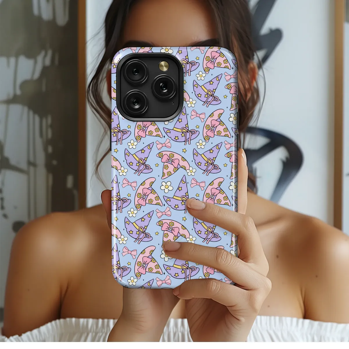 Step into a world of whimsical enchantment with this utterly charming design, a perfect little piece of everyday magic to carry with you. Imagine a dreamy sky of soft periwinkle blue, where a delightful pattern of pastel witch hats dance among twinkling stars and sweet, simple daisies. Each hat is a tiny work of art; some in a gentle lavender adorned with golden crescent moons and stars, others in a lovely blush pink scattered with cheerful little flowers and tied with a perfect, pretty bow. This isn't just a pattern; it's a feeling—a whisper of cozy magic and cottagecore daydreams. The soft, sweet color palette evokes a sense of playful nostalgia and serene joy, making it the ideal accessory for anyone who loves the kawaii aesthetic, pastel goth vibes, or simply wants to add a sprinkle of starlight to their daily routine. Protect your most essential companion in a style that is uniquely you, wrapping it in a durable, vibrant design that celebrates the magical, the cute, and the wonderfully witchy. Let this sweet celestial artwork guard your connection to the world, making every glance a reminder to seek out the sparkle in the everyday.