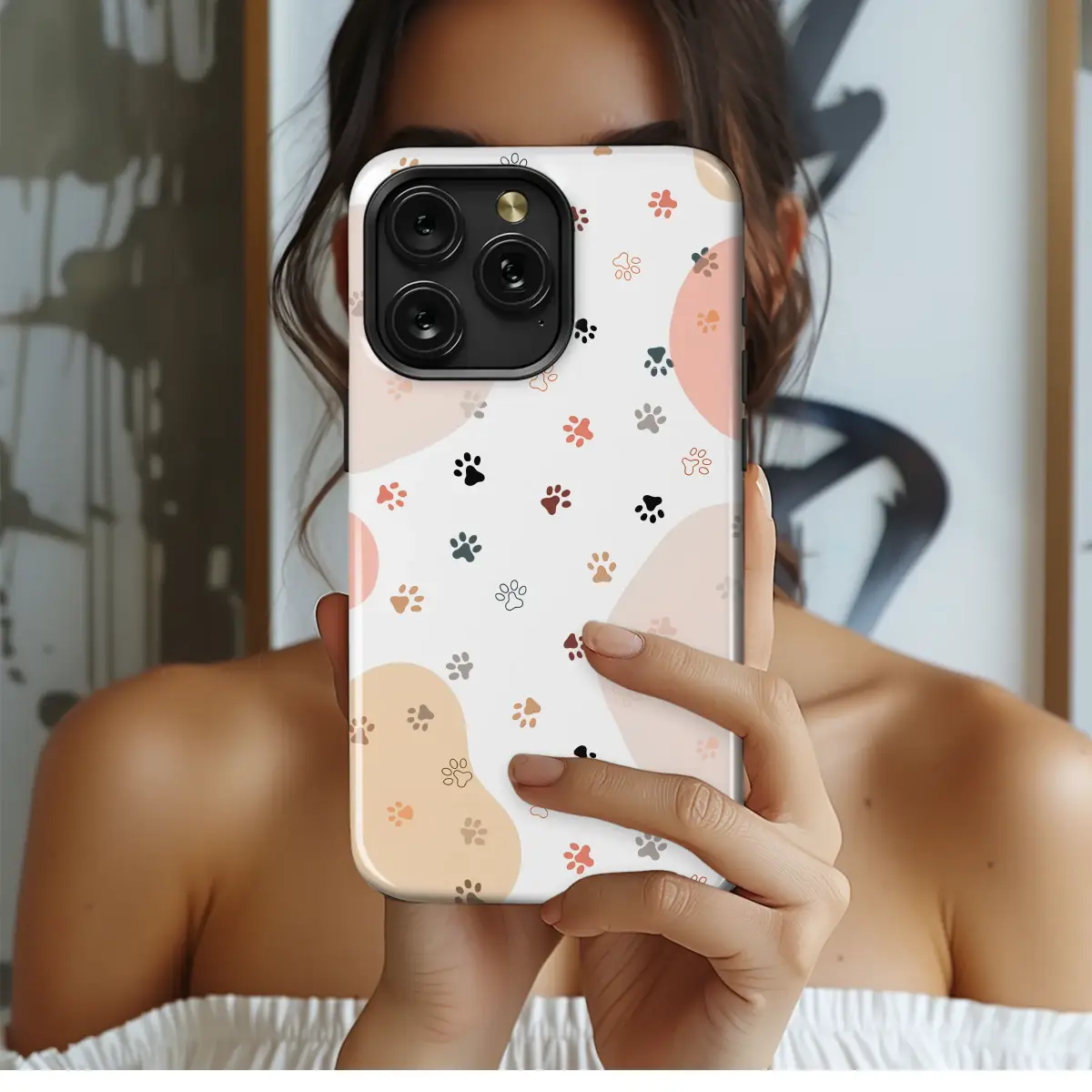 Celebrate the joyful pitter-patter of tiny paws with this heartwarming design, a beautiful tribute to our furry best friends. A delightful scatter of whimsical paw prints dances across a clean, modern canvas, each one a unique mark of love and companionship. Some are solid, some just an outline, creating a playful, dynamic texture that captures the spirit of our animal companions. The color palette is a soothing dream of earthy neutrals and soft pastels, featuring organic shapes in blush pink, warm sandy beige, and gentle taupe. These soft blobs of color create a gentle backdrop for the paw prints, which pop in shades of terracotta, deep charcoal, and muted teal. This abstract, minimalist pattern blends contemporary boho style with a deeply personal sentiment, making it the perfect artistic accessory for any proud dog mom, cat lover, or devoted pet parent. Let this charming artwork be a daily reminder of the unconditional love, muddy footprints, and endless cuddles that fill your life. It's more than just a pattern; it's a small piece of art that carries the story of your beloved companion, wrapping your everyday essential in warmth, style, and pure happiness. Personalize your gear with this sweet, understated design and carry a piece of your heart wherever you go.