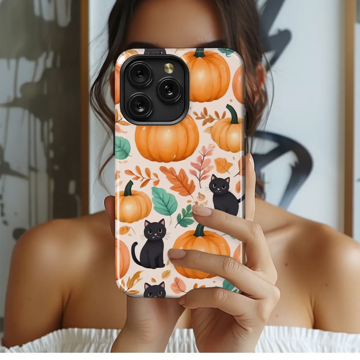 Step into a whimsical wonderland where autumn's magic comes to life, wrapping your favorite accessory in the charm of the harvest season. This enchanting design captures the very heart of cozy autumn days, featuring a vibrant tapestry of plump, sun-kissed pumpkins nestled amongst charming little black cats with curious, wide eyes and the tiniest hint of spooky mischief. Each feline friend sits amidst a delicate scattering of crisp, fallen leaves painted in a rich palette of amber, rust, and muted teal, creating a picturesque scene straight from a storybook pumpkin patch. The delightful pattern evokes the comforting feeling of a warm sweater, the scent of cinnamon spice in the air, and the gentle rustle of leaves underfoot. It’s the perfect way to carry a touch of Halloween cheer and harvest-time joy with you on all your daily adventures. This artwork is more than just a pattern; it’s an invitation to celebrate the spookiest, coziest time of the year in style. An ideal aesthetic gift for any cat lover, autumn enthusiast, or anyone who finds pure joy in the simple, magical moments of the fall season. Let this charming design be your daily reminder of crisp air, pumpkin spice lattes, and adorable feline companions.