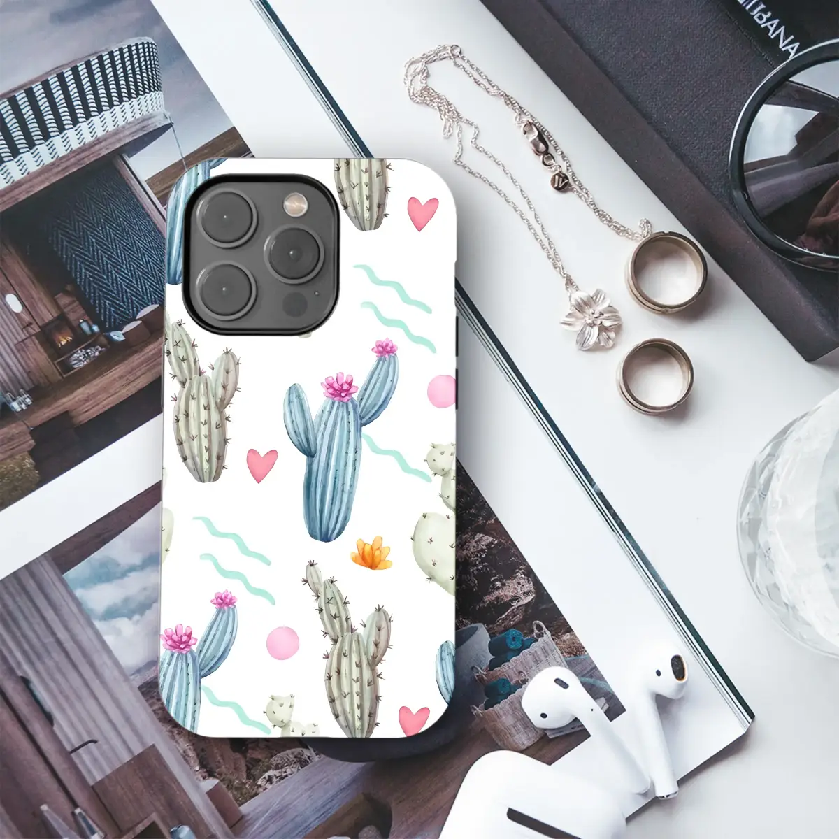 Step into a playful desert dream with this enchanting watercolor design, a perfect escape for your most essential accessory. This delightful pattern captures the resilient spirit of the desert with a soft, artistic touch, featuring a charming array of hand-painted cacti. From tall, stoic saguaros crowned with vibrant pink blossoms to sweet, heart-shaped prickly pears, each succulent is rendered in gentle hues of blue, green, and sage. Whimsical elements like tiny pink hearts, sunny orange flowers, and playful teal squiggles dance between the cacti, adding a pop of modern charm and cheerful color against a clean white canvas. This design is a celebration of nature's quirky beauty, ideal for the plant lover, the bohemian spirit, or anyone looking to carry a piece of artistic sunshine with them. It’s more than just a pretty pattern; it’s a tiny piece of art that brings a sense of warmth and free-spirited joy to your daily life, reminding you to find the love in every prickly moment.