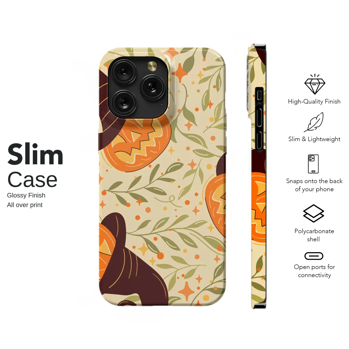 Embrace the enchanting spirit of the spooky season with this captivating artwork, where cozy magic and autumnal charm intertwine. Cheerful jack-o'-lanterns, each adorned with a whimsical witch hat, peek out from a tapestry of delicate botanical vines and leaves. The warm, retro-inspired palette of vibrant orange, deep brown, and soft olive green evokes the feeling of a crisp autumn day spent at a magical pumpkin patch. Glimmering stars and festive dots are scattered throughout, adding a sprinkle of enchantment and joy to the scene. This design is a celebration of all things fall, capturing the heartwarming, slightly mischievous spirit of Halloween in a timeless, illustrative style. It’s the perfect way to carry a piece of festive flair with you, adding a pop of seasonal personality and storybook wonder to your everyday essentials. Let these smiling, bewitched pumpkins bring a warm glow to your world and keep the delightful fall vibes alive all year long.