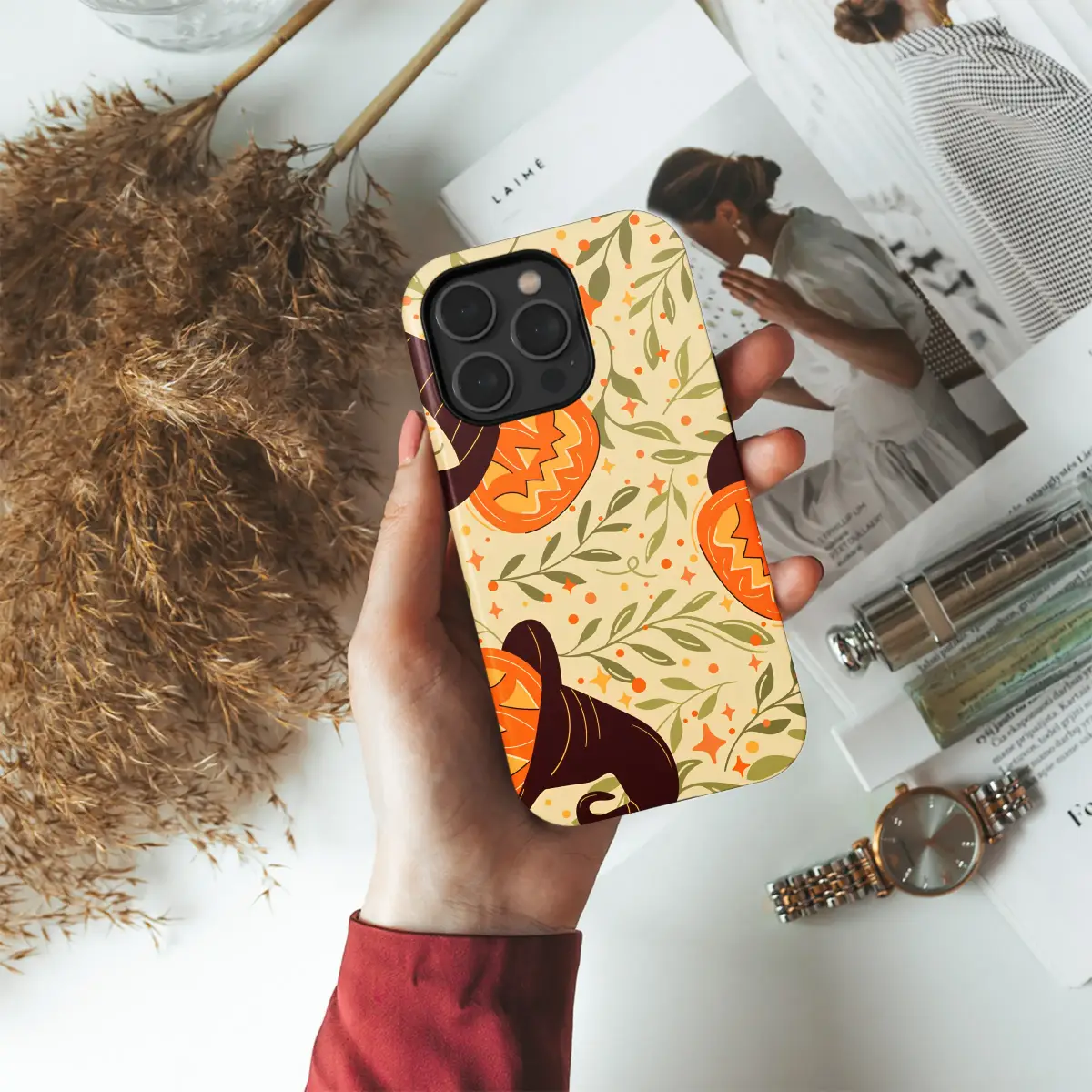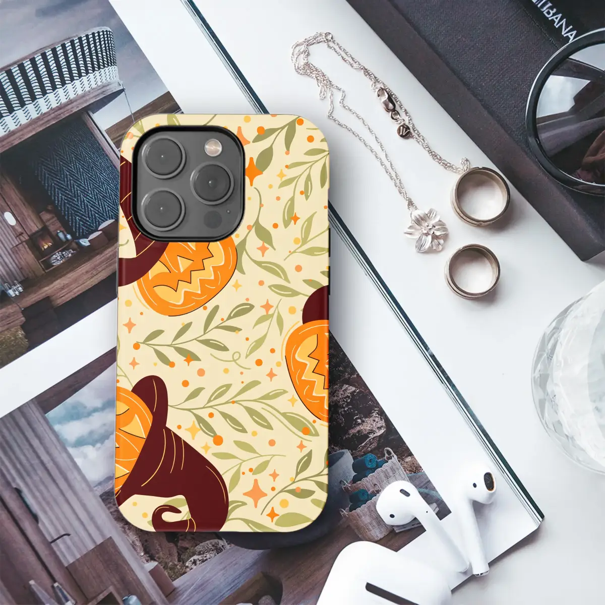Embrace the enchanting spirit of the spooky season with this captivating artwork, where cozy magic and autumnal charm intertwine. Cheerful jack-o'-lanterns, each adorned with a whimsical witch hat, peek out from a tapestry of delicate botanical vines and leaves. The warm, retro-inspired palette of vibrant orange, deep brown, and soft olive green evokes the feeling of a crisp autumn day spent at a magical pumpkin patch. Glimmering stars and festive dots are scattered throughout, adding a sprinkle of enchantment and joy to the scene. This design is a celebration of all things fall, capturing the heartwarming, slightly mischievous spirit of Halloween in a timeless, illustrative style. It’s the perfect way to carry a piece of festive flair with you, adding a pop of seasonal personality and storybook wonder to your everyday essentials. Let these smiling, bewitched pumpkins bring a warm glow to your world and keep the delightful fall vibes alive all year long.