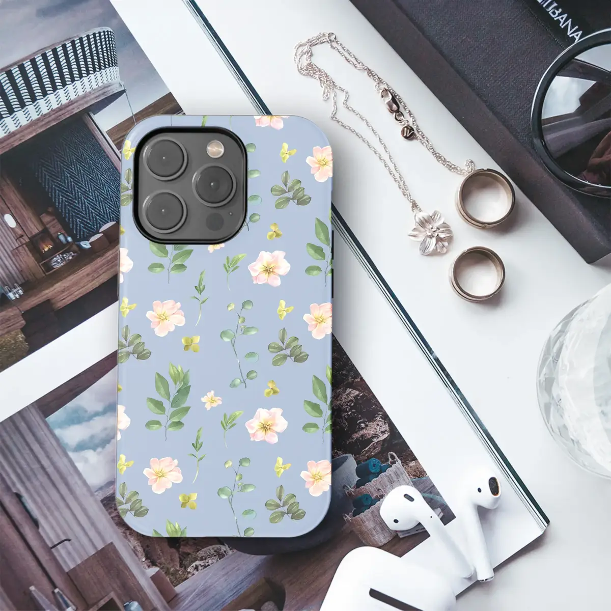Wander through a whispering meadow every time you glance at your daily companion. This exquisite botanical artwork envelops your most essential accessory in the tranquil beauty of a secret garden. Captured in delicate, translucent watercolor, soft blush pink blossoms with sunny yellow centers drift across a dreamy periwinkle blue background, evoking the gentle calm of a twilight sky. Interspersed are elegant sprigs of silver-dollar eucalyptus and a variety of fresh green leaves, each one painted with lifelike detail and gentle artistry. This seamless pattern creates a continuous floral tapestry that is both soothing and captivating. The design embodies a romantic, cottagecore aesthetic, perfect for anyone who finds joy in nature's simple elegance. Let this serene nature art transform your tech into a personal statement of style and grace. It’s more than just a pattern; it’s a portable piece of tranquility, a delicate flower design that brings a touch of the outdoors to your fingertips. This elegant artwork is a thoughtful gift for her, a lover of botanical prints, or a beautiful way to infuse your own day with the timeless charm of a wildflower field. Carry this small masterpiece and let its gentle spirit brighten your moments.
