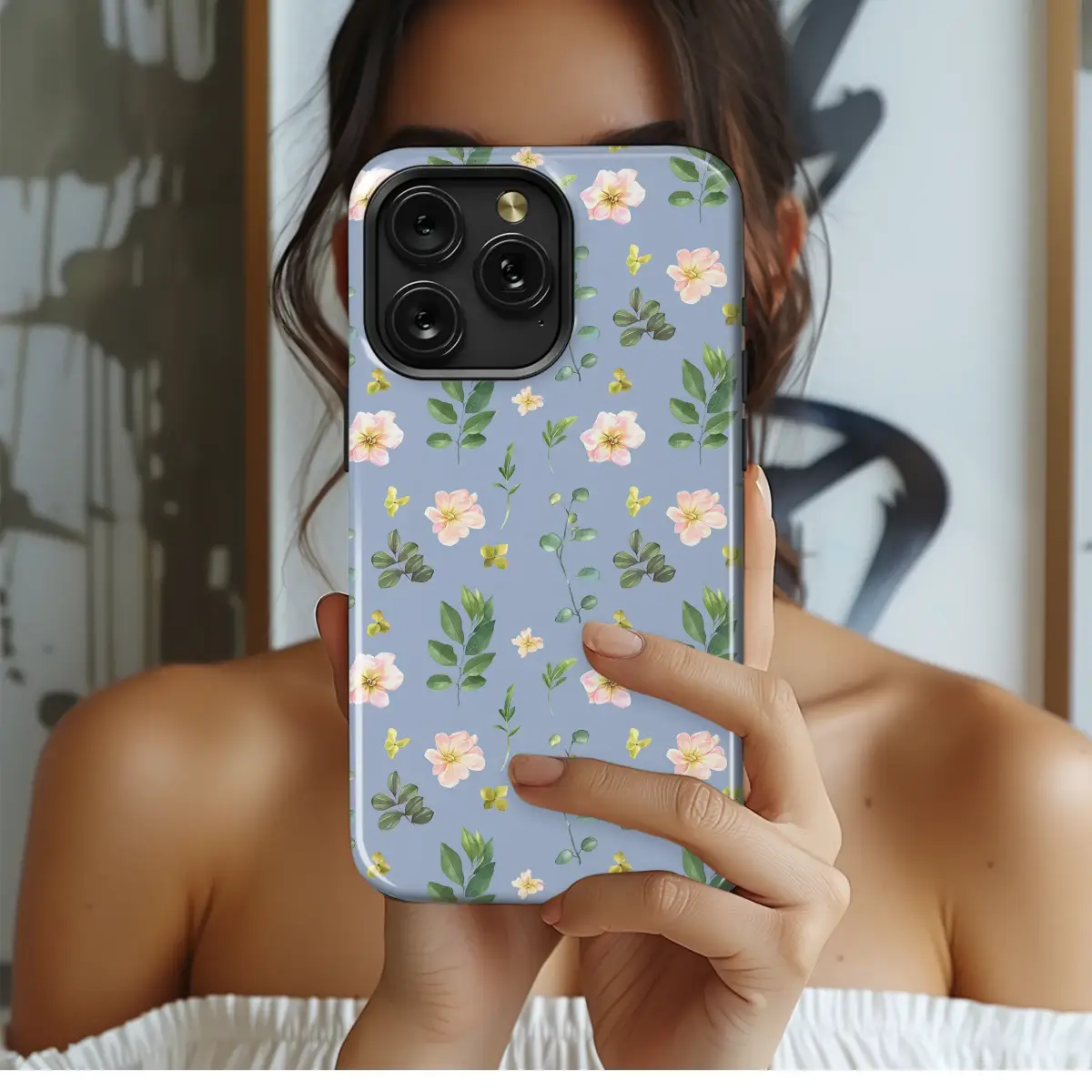 Wander through a whispering meadow every time you glance at your daily companion. This exquisite botanical artwork envelops your most essential accessory in the tranquil beauty of a secret garden. Captured in delicate, translucent watercolor, soft blush pink blossoms with sunny yellow centers drift across a dreamy periwinkle blue background, evoking the gentle calm of a twilight sky. Interspersed are elegant sprigs of silver-dollar eucalyptus and a variety of fresh green leaves, each one painted with lifelike detail and gentle artistry. This seamless pattern creates a continuous floral tapestry that is both soothing and captivating. The design embodies a romantic, cottagecore aesthetic, perfect for anyone who finds joy in nature's simple elegance. Let this serene nature art transform your tech into a personal statement of style and grace. It’s more than just a pattern; it’s a portable piece of tranquility, a delicate flower design that brings a touch of the outdoors to your fingertips. This elegant artwork is a thoughtful gift for her, a lover of botanical prints, or a beautiful way to infuse your own day with the timeless charm of a wildflower field. Carry this small masterpiece and let its gentle spirit brighten your moments.