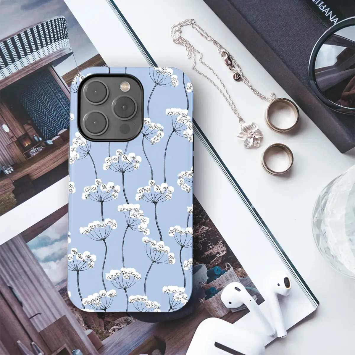 Step into a serene meadow under a vast, periwinkle sky with this enchanting botanical design, a tribute to the quiet beauty of nature. Delicate, hand-sketched stems of Queen Anne's Lace dance gracefully across the calming blue canvas, each crowned with a soft, cloud-like cluster of tiny white blossoms. The fine black line art provides a beautiful, sophisticated contrast, capturing the intricate, lacy detail of this beloved wildflower with artistic flair. This unique pattern feels both timeless and modern, perfectly blending the rustic charm of a country field with a clean, minimalist aesthetic. It’s an ideal accessory for anyone who adores the cottagecore trend, loves floral patterns, or simply wants to carry a piece of tranquility with them. Imagine a gentle breeze rustling through tall grasses; this artwork is a portal to that peaceful moment. More than just a pretty design, it’s a wearable piece of illustration that infuses your daily life with elegance and personality. It’s a subtle yet captivating statement, a beautiful reminder to find peace and wonder in the natural world. Let this delicate wildflower print bring a breath of fresh meadow air to your every day, making it the perfect nature lover gift for her, or a special treat for yourself.