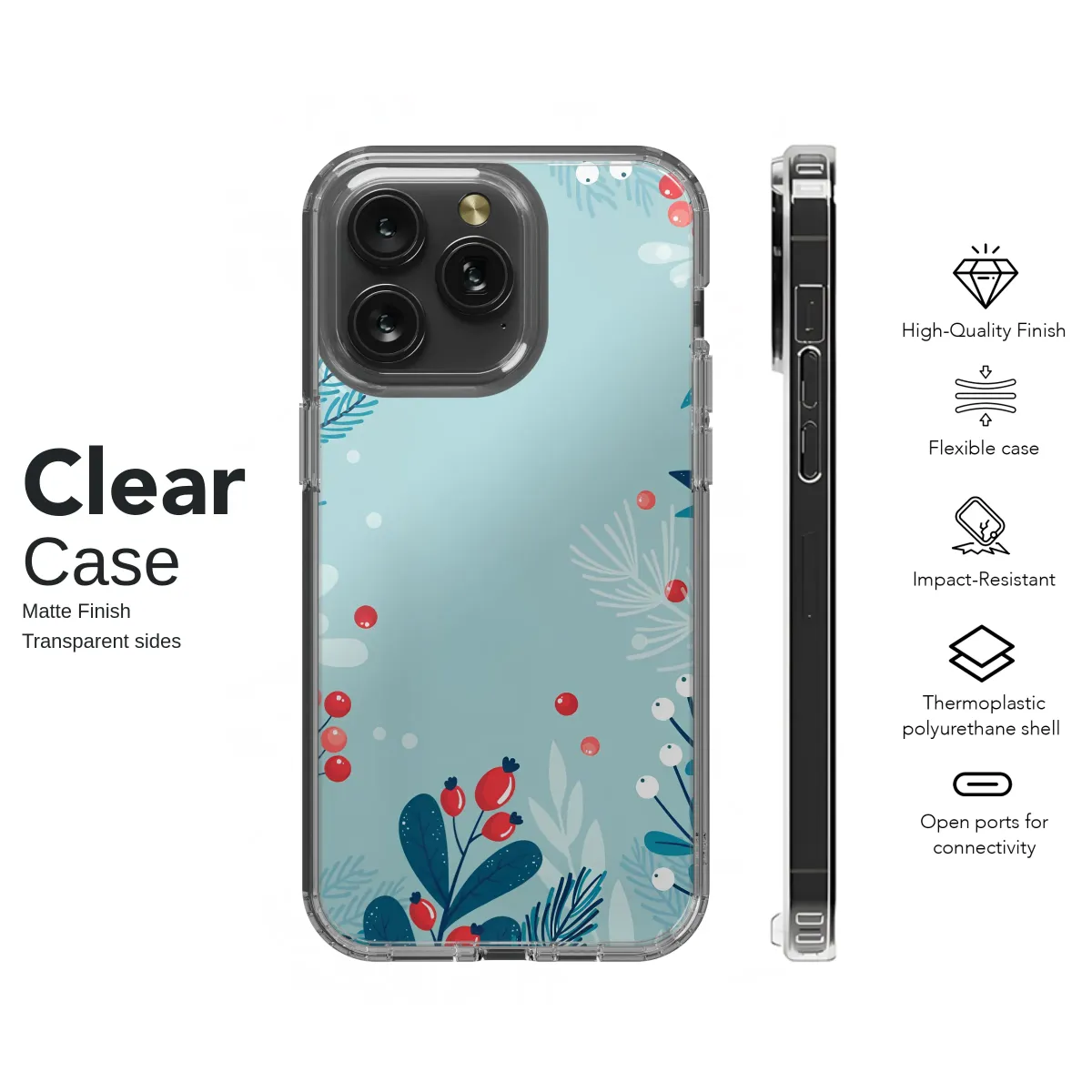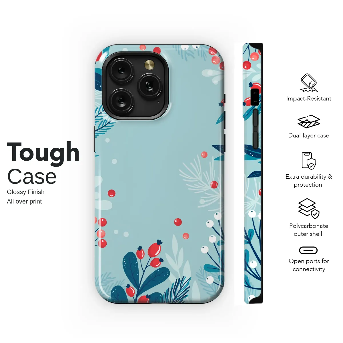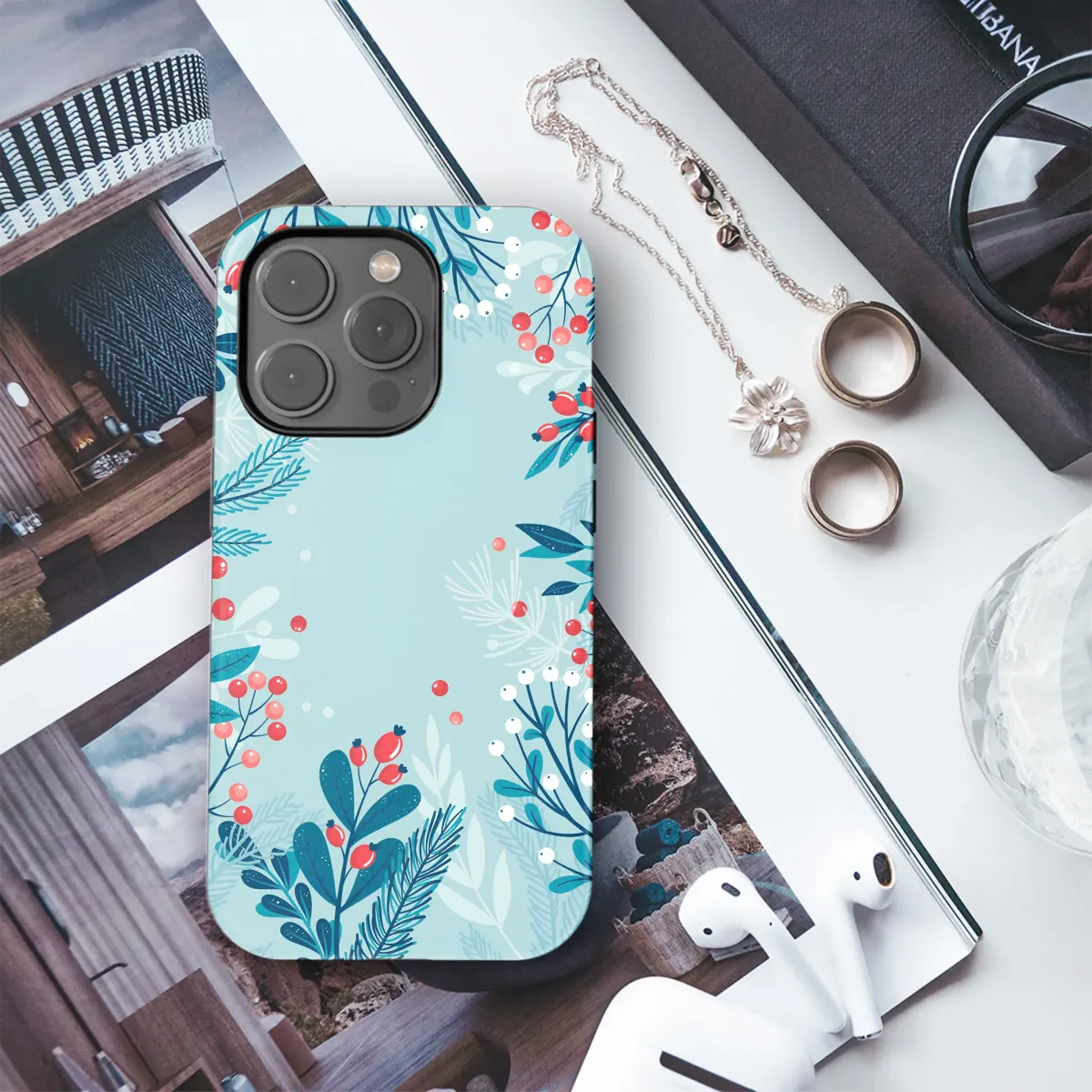 Embrace the serene magic of a frost-kissed forest with this enchanting botanical artwork. Imagine the quiet hush of a winter morning, where vibrant red berries burst forth like tiny, cheerful jewels against a canvas of cool, icy blues and deep teals. This captivating design features a delicate dance of wintry foliage—from the sharp, detailed lines of pine needles to the soft clusters of snowy white berries and elegant rosehips. Each element is thoughtfully placed, creating a layered tapestry that evokes the crisp, clean air and the peaceful solitude of a walk in the woods. This piece is more than just a pattern; it's a small sanctuary of calm, a whisper of nature's poetry that you can carry with you, transforming your everyday essential into a statement of personal style. It's the perfect accessory for those who adore a cozy winter aesthetic, a minimalist nature illustration that adds a touch of elegance to any look. Whether as a thoughtful holiday gift for a loved one or a treat for yourself, this design wraps your favorite gadget in the timeless beauty of the season, a constant reminder of nature's delicate artistry.