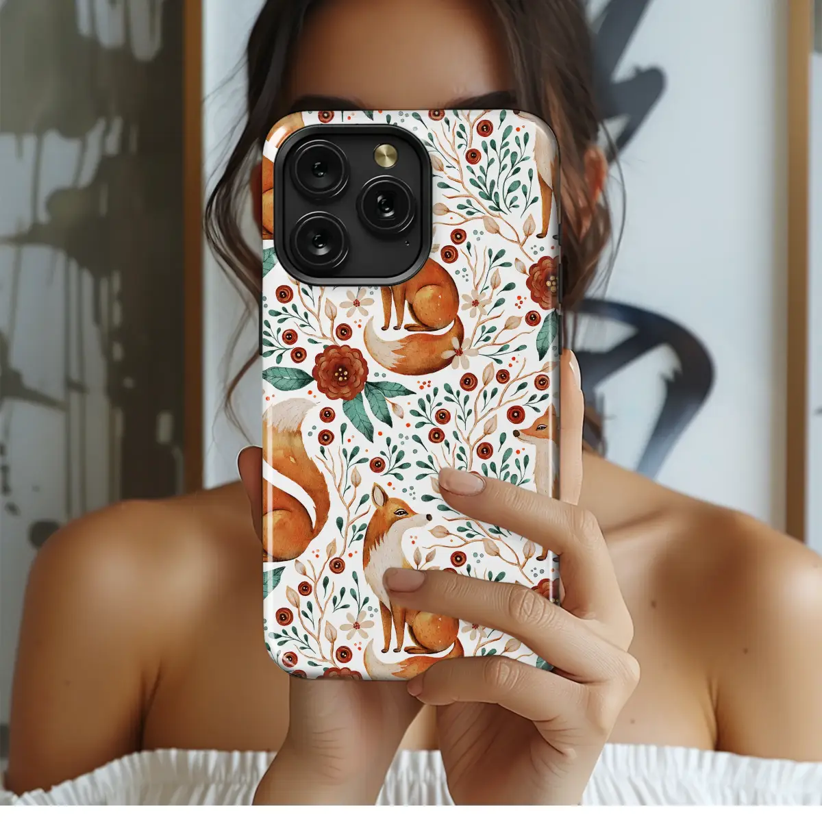 Step into a whimsical woodland glade every time you reach for your daily essential. This enchanting fox and botanical design captures the quiet magic of a crisp autumn day, wrapping your most-used device in a tapestry of folk art charm. Rendered in a stunning watercolor style, each sly fox, with its warm russet fur and clever gaze, is nestled amongst a flourish of rich, earthy florals, delicate stems, and serene teal leaves. It’s a durable piece of art that serves as a beautiful guardian for your tech, transforming a simple necessity into a statement of your love for the wild. Perfect for the cottagecore dreamer, the nature lover, or anyone seeking a touch of rustic elegance, this design brings the serene beauty of the forest to the palm of your hand. It's an ideal aesthetic gift for her, a thoughtful present for a friend, or a personal treat to celebrate the fall season. Let this charming woodland animal illustration be your clever companion, carrying a pocketful of wilderness and wonder with you on all of your adventures.