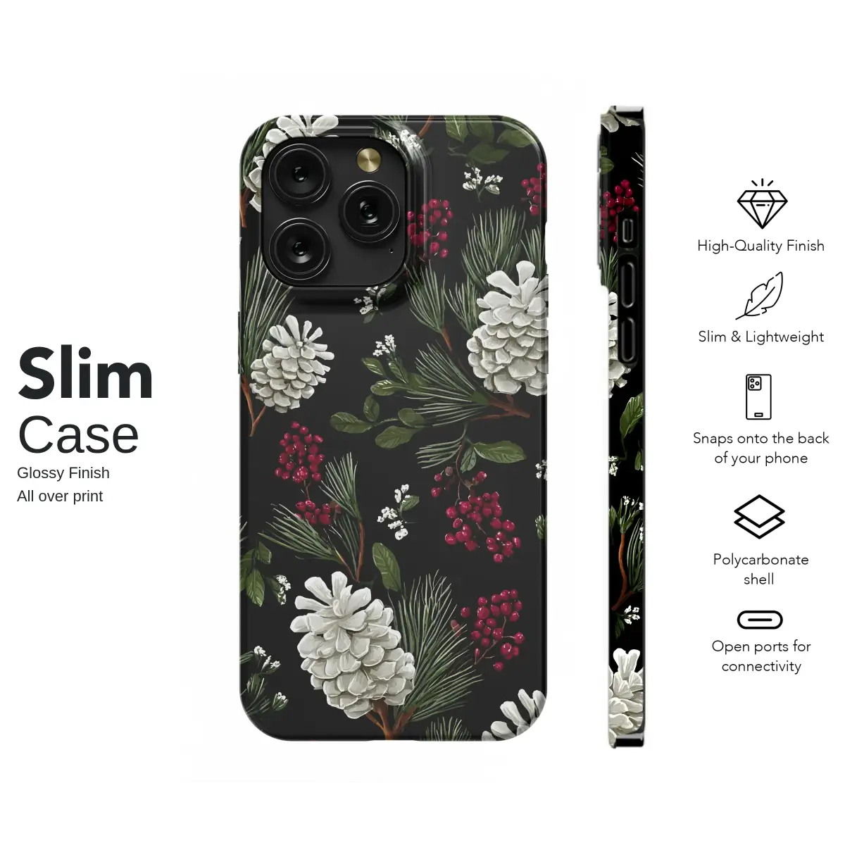 Embrace the beauty of the winter season with this elegant botanical design. Featuring a striking pattern of illustrated white pine cones, lush evergreen needles, and vibrant clusters of red berries set against a deep black background. This nature-inspired artwork brings a touch of festive woodland charm to your style, perfect for the holidays or for any nature lover.