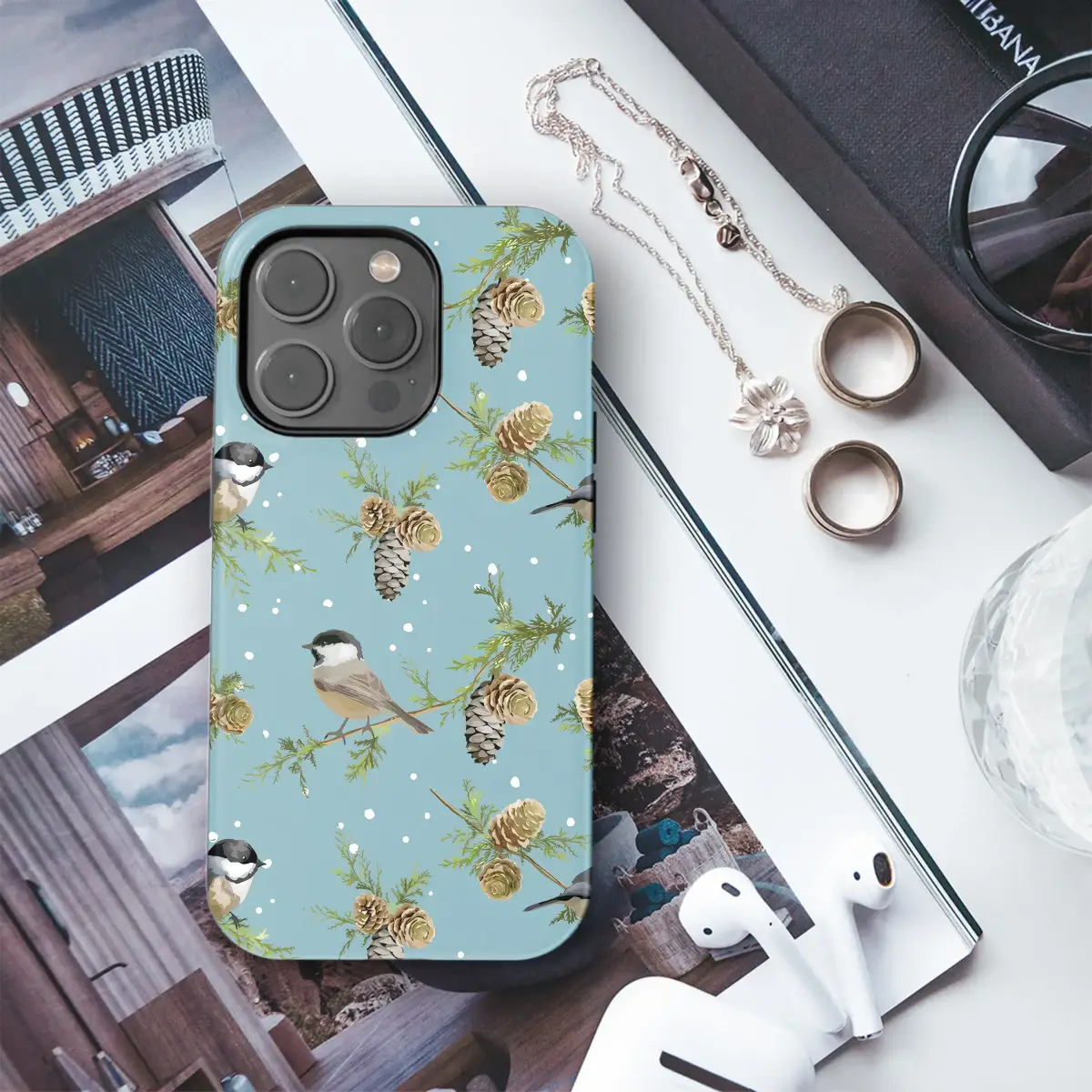 Embrace the quiet beauty of a snowy day with this charming winter bird design. This nature-inspired pattern features delightful chickadees perched on evergreen pine branches, surrounded by rustic pinecones and gently falling snow against a serene blue backdrop. It's a perfect artistic touch for any nature enthusiast or bird lover, bringing a touch of woodland elegance to your everyday.