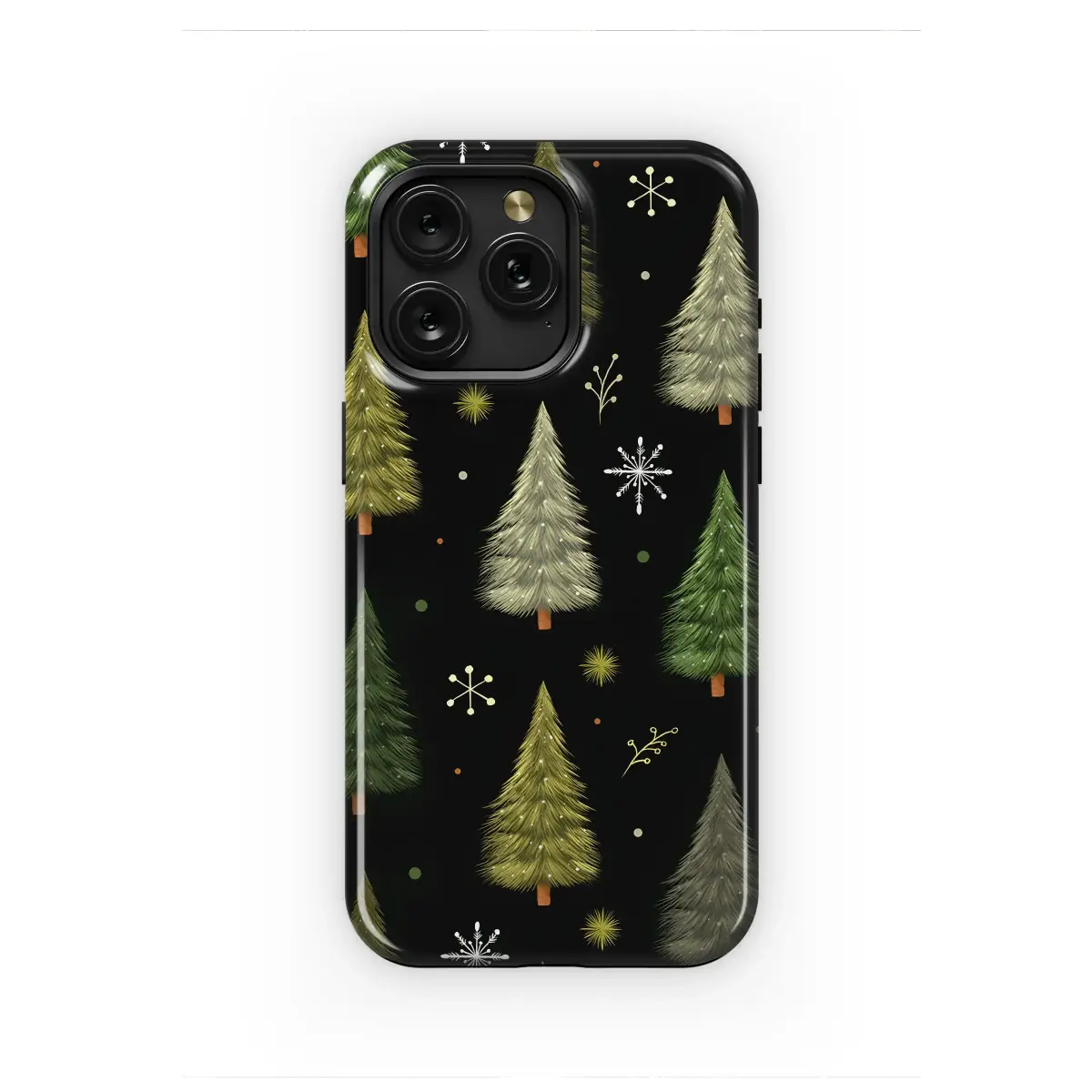 Embrace the holiday spirit with this charming winter forest design. A delightful pattern of rustic pine trees in various shades of green is set against a deep black background, dotted with delicate white snowflakes and festive accents. This cozy and festive artwork captures the magic of a snowy Christmas night, making it a wonderful way to celebrate the season.