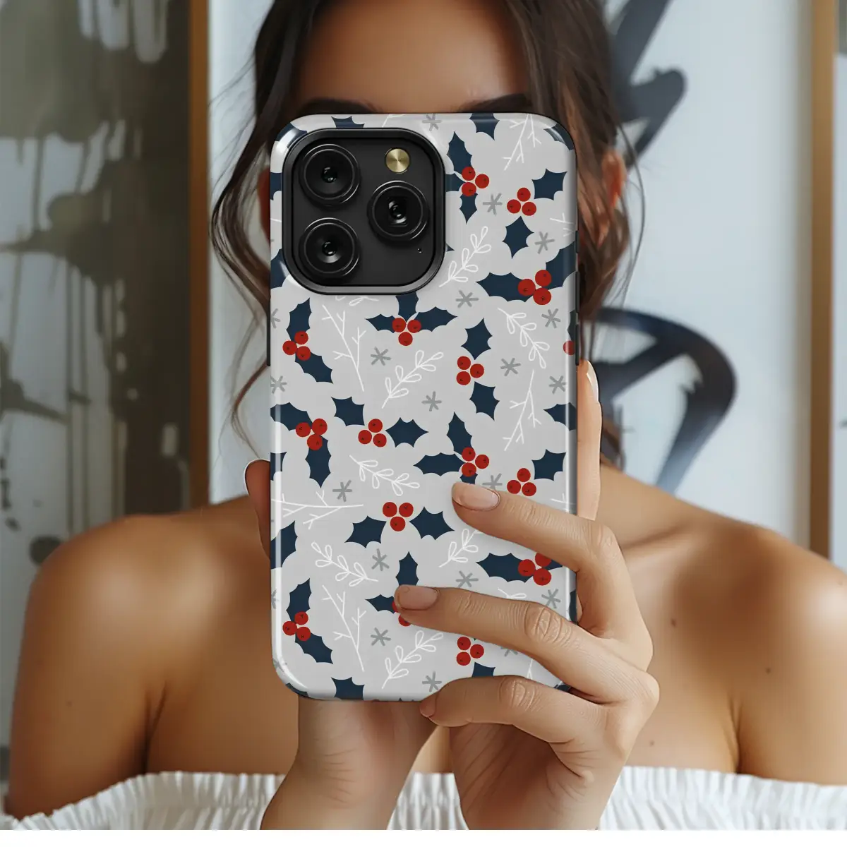 Embrace the serene beauty of the holiday season with this enchanting winter frost design. Wrap your most-used accessory in the quiet magic of a crisp winter morning, where deep navy holly leaves and vibrant crimson berries dance elegantly across a soft, misty grey background. Delicate, frosty-white branches and charmingly simple snowflakes scatter throughout, creating a seamless pattern that is both festive and wonderfully sophisticated. This modern, Scandinavian-inspired artwork captures the cozy essence of hygge, transforming your tech into a statement of minimalist holiday cheer. It’s the perfect way to carry a piece of winter's enchantment with you, protecting your device with a touch of artistic flair. More than just a pretty pattern, it's a daily reminder of the joyful spirit and peaceful moments the holidays bring. Whether you're treating yourself or searching for the perfect stocking stuffer or secret Santa gift, this unique botanical illustration is a thoughtful choice for friends, family, or anyone who appreciates the subtle elegance of yuletide decor. Let this artful accessory bring a daily dose of joy and a whisper of winter wonder to your routine, celebrating the season in style.