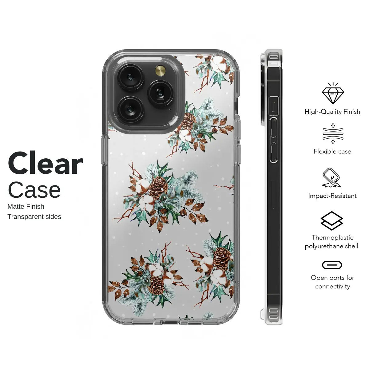 Embrace the serene beauty of the winter season with this elegant botanical design. This charming pattern features detailed illustrations of rustic pinecones, soft cotton bolls, and frosty pine branches, all set against a gentle, snowy backdrop.