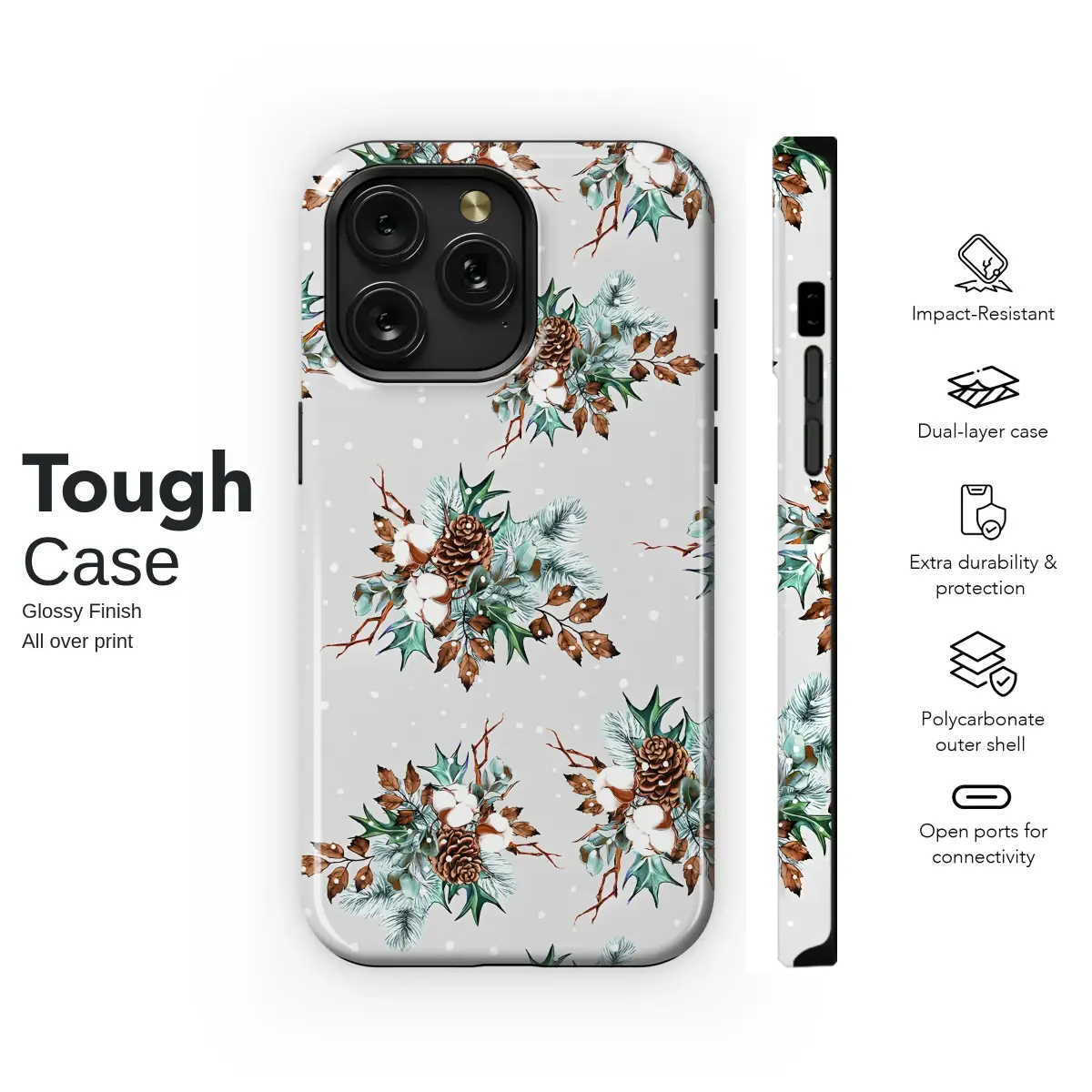 Embrace the serene beauty of the winter season with this elegant botanical design. This charming pattern features detailed illustrations of rustic pinecones, soft cotton bolls, and frosty pine branches, all set against a gentle, snowy backdrop.