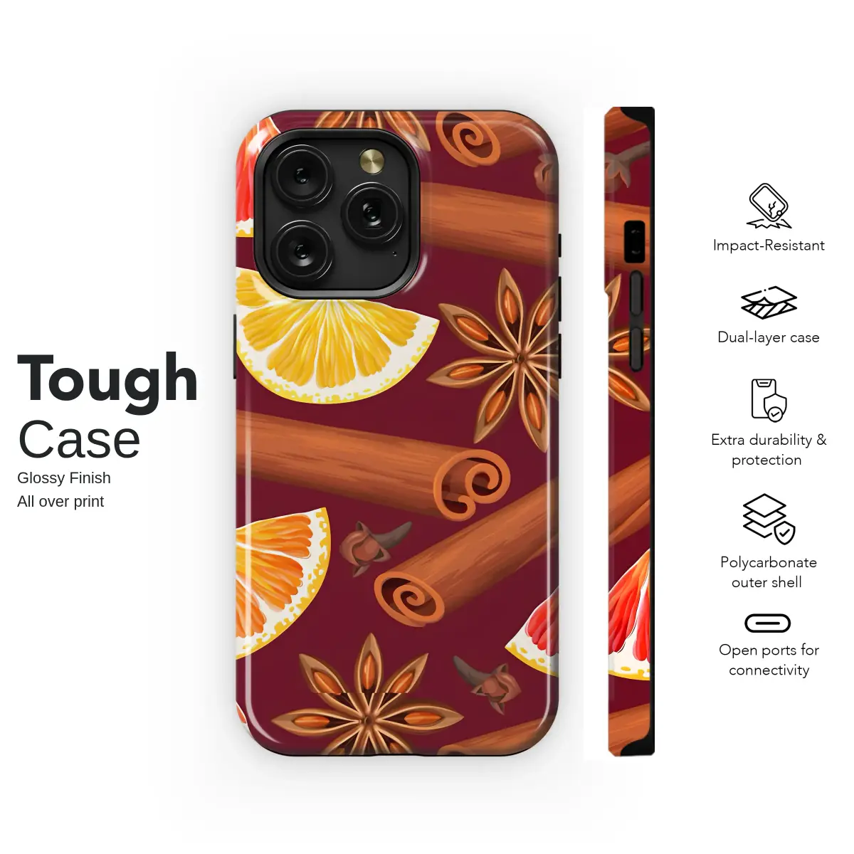 Embrace the cozy spirit of the season with this festive winter spice design. The pattern features richly illustrated slices of orange and blood orange, nestled with aromatic cinnamon sticks, star anise, and cloves. Set against a deep burgundy backdrop, this artwork evokes the warm, comforting feeling of autumn holidays and spiced citrus delights.