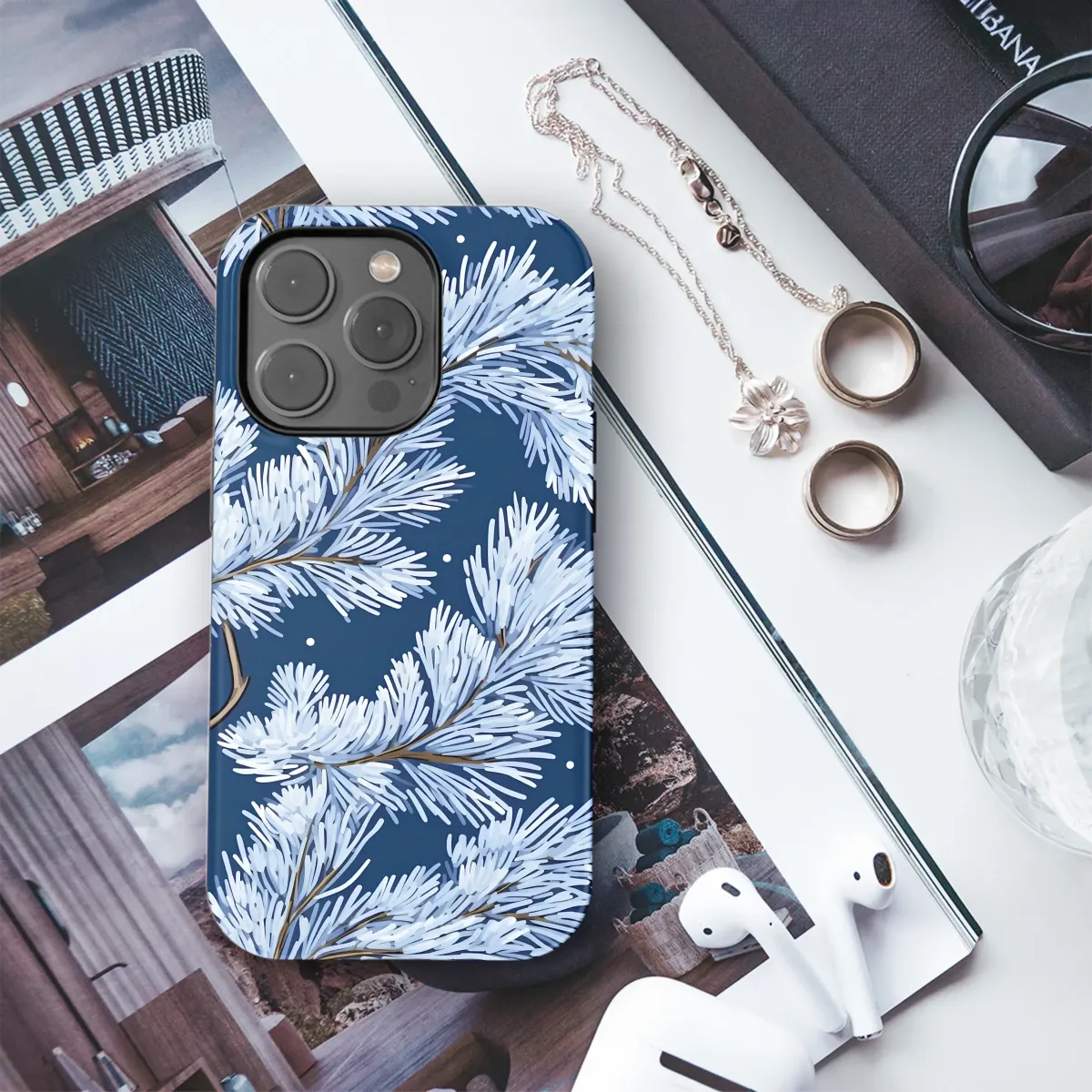 Step into the serene beauty of a still winter's night with this enchanting botanical artwork. Imagine the quiet hush of a forest under a blanket of fresh snow, where delicate pine branches are kissed by a crystalline frost. Each needle is artfully detailed in shades of icy blue and crisp white, standing in beautiful contrast against a deep midnight blue sky where soft snowflakes gently drift. This design captures the tranquil and magical essence of the winter season, offering a momentary escape into nature's quiet splendor. It’s more than just a design; it's a piece of the peaceful solitude of a winter wonderland, a way to carry the calm and cozy spirit of the holidays with you every day. Let this elegant evergreen pattern adorn your most essential tech, transforming it into a unique accessory that speaks to your love for nature's subtle artistry. A perfect, thoughtful gift for anyone who cherishes the quiet magic of a snowy evening, this piece brings a touch of winter's grace to the palm of your hand, wrapping your device in a whisper of the cold, crisp air and the timeless beauty of the forest.
