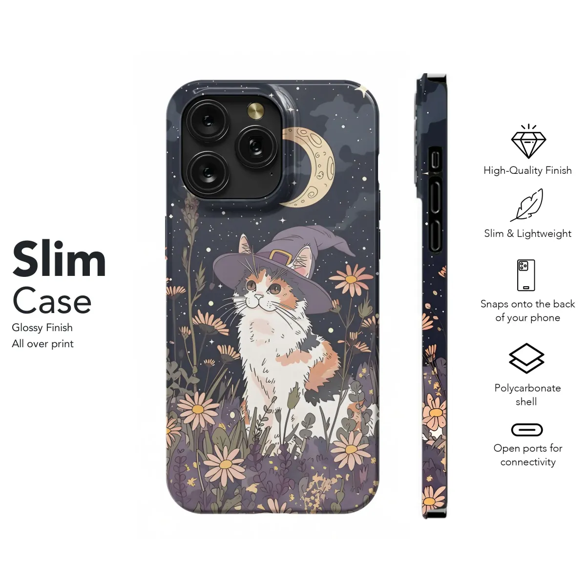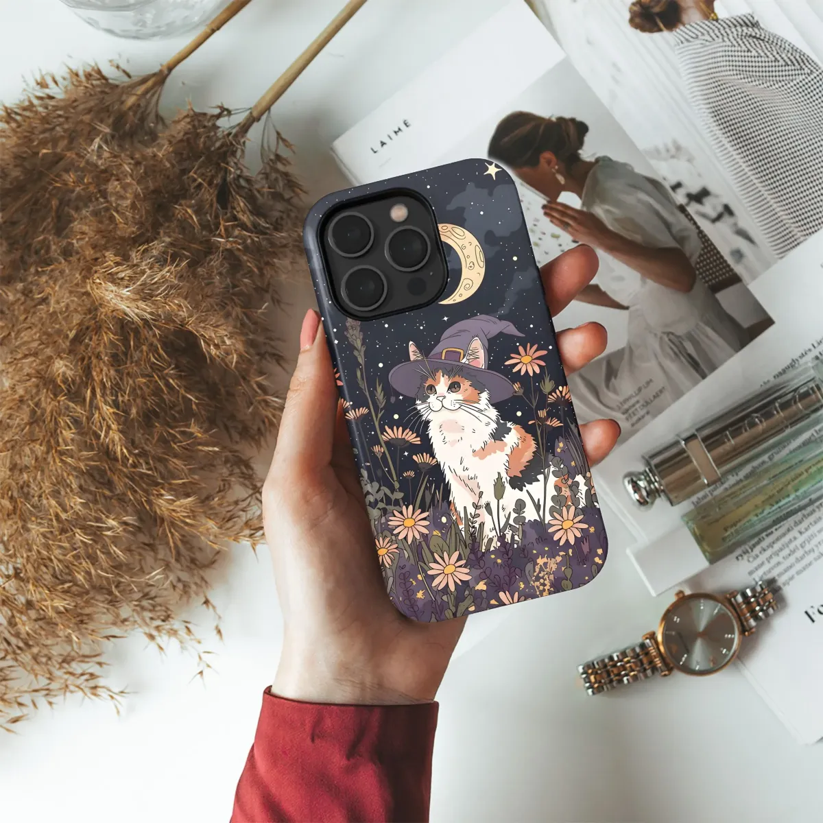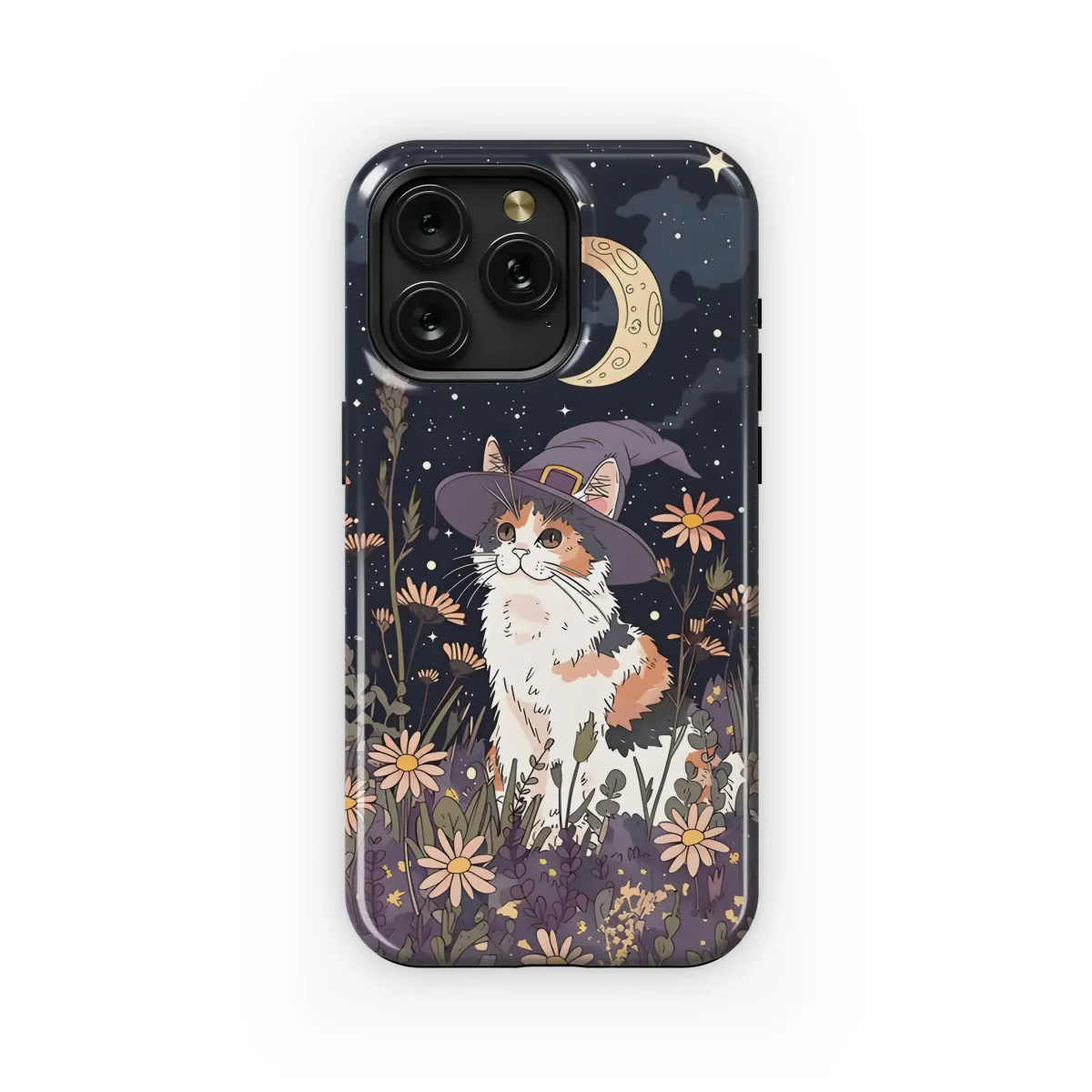 Step into a world of enchantment with this captivating illustration, perfect for adding a touch of magic to your everyday items. This unique design features an adorable calico cat donned in a whimsical witch hat, gazing up at a luminous crescent moon against a backdrop of a deep, starry night sky. The sweet feline sits nestled amongst a vibrant field of wildflowers and lush greenery, creating a beautiful contrast between the cozy cottagecore aesthetic and the mystical celestial display. The scene is alive with tiny stars twinkling above, adding to the overall dreamy and magical atmosphere. This art piece embodies a perfect blend of spooky-cute charm and natural beauty, appealing to cat lovers, fans of witchy aesthetics, and anyone who adores enchanting animal art. Imagine this charming calico familiar and starry night landscape bringing a smile to your face every time you look at it. It's a delightful piece for anyone who cherishes unique digital illustrations and seeks out mystical, nature-inspired, or fantasy art. This versatile design is a wonderful way to express your personal style or makes a thoughtful gift for fellow lovers of whimsical creatures and celestial wonders. The detailed artistry captures the playful spirit of the cat and the serene beauty of the night, making it a truly special item.