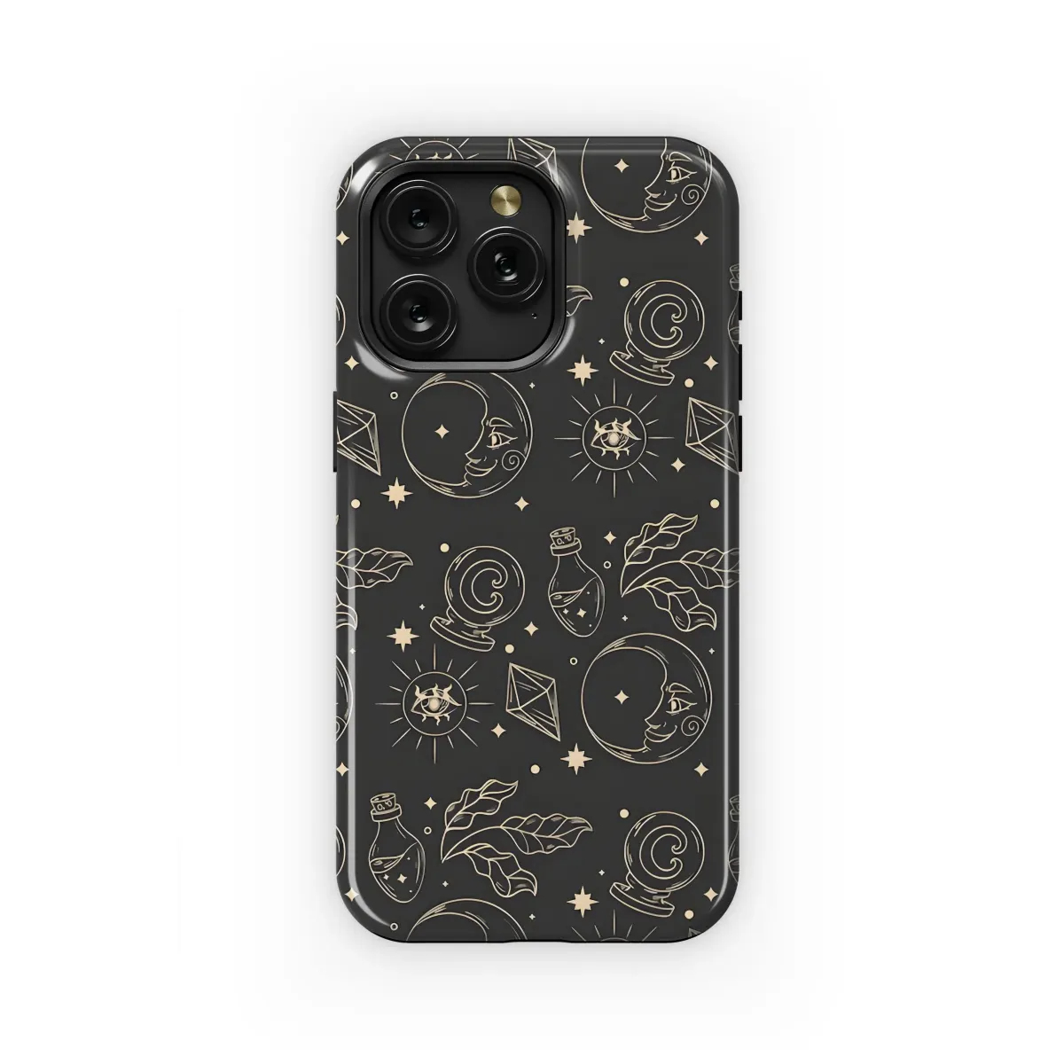 Step into a realm of enchantment with this captivating seamless pattern, a visual tapestry woven with celestial and mystical wonders that invite you to explore the mysteries of the universe. This original design features charming crescent moons smiling alongside radiant suns adorned with ancient, all-seeing eyes, evoking deep cosmic connection and intuitive wisdom. Scattered throughout are beautifully detailed illustrations of classic mystical tools essential for any spiritual journey: swirling crystal balls hinting at future visions and hidden truths, delicate potion bottles holding secret elixirs and powerful concoctions, and faceted crystals radiating pure, grounding energy. Lush, hand-drawn leafy branches add an organic, nature-infused witchy touch, while scattered stars and shimmering stardust dots complete the magical, boundless night sky scene. Rendered in a timeless, vintage-inspired outline doodle style, this pattern offers a unique blend of boho charm, spiritual depth, and occult intrigue. It's perfect for anyone who feels a strong pull towards the spiritual path, the wonders of astrology, or the simply magical aspects of life. Imagine carrying a piece of this mystic universe with you throughout your day, transforming an essential everyday item into a personal talisman and a statement piece. This celestial print is ideal for expressing your unique inner witch, your profound love for the cosmos, or your vibrant connection to bohemian spirituality. It adds a layer of depth, personality, and personal meaning to your digital companion, making a statement that is both subtly spiritual, visually striking, and undeniably stylish. This witchy aesthetic appeals specifically to lovers of tarot, divination practices, cosmic art, and anyone seeking to infuse their surroundings with magic and meaning. The intricate detail, thoughtful composition, and rich symbolism make it a truly standout design, perfect for adding a touch of personalized magic to your technology and elevating your connection to the mystic arts.