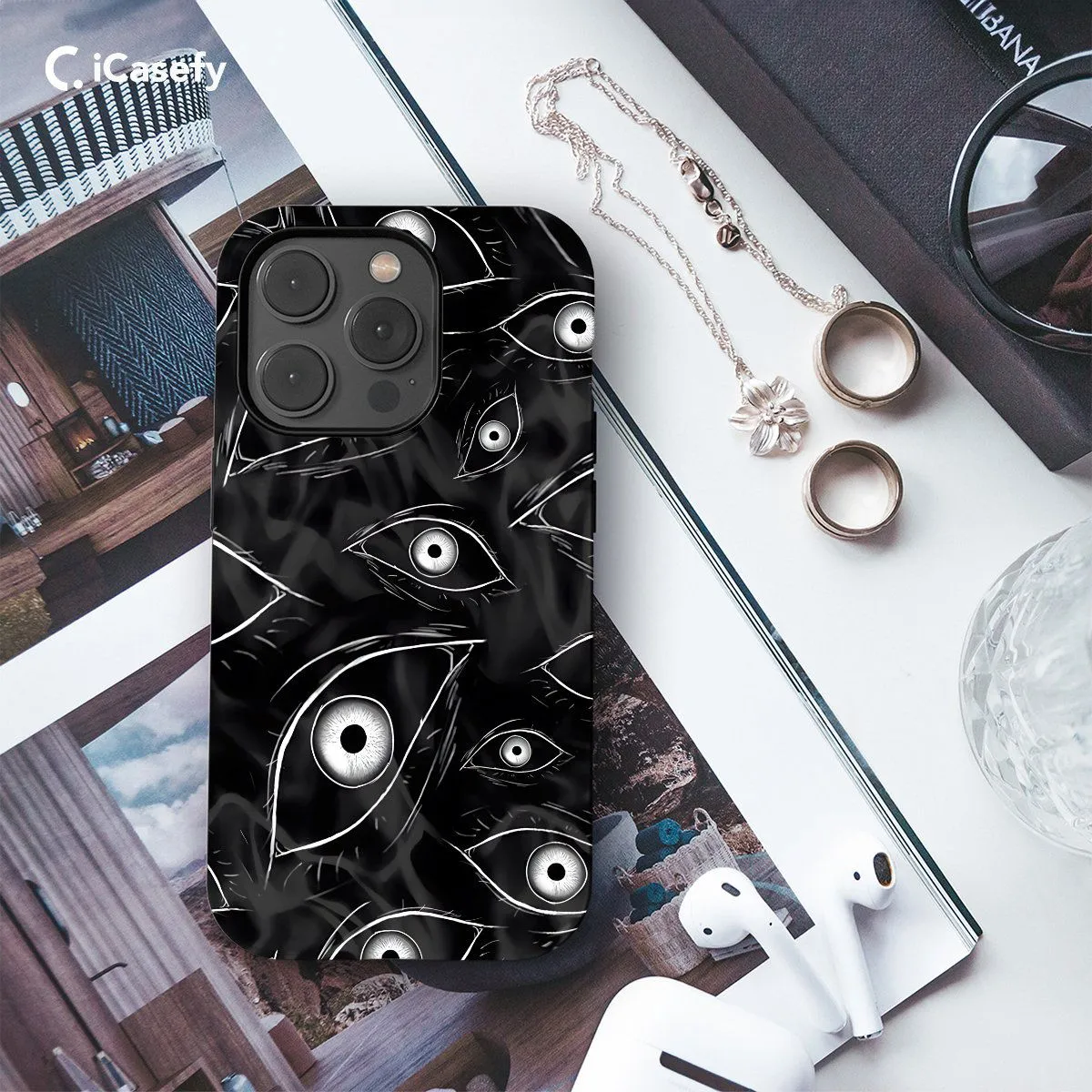 Dive into the eerie depths of the supernatural with this chilling phone case, adorned with witchy eyes that peer into the darkness. Inspired by the macabre allure of horror, this case conjures a sense of mystery and unease. Embrace the darkness and let your device reflect your fascination with the occult and the unknown with this haunting accessory.