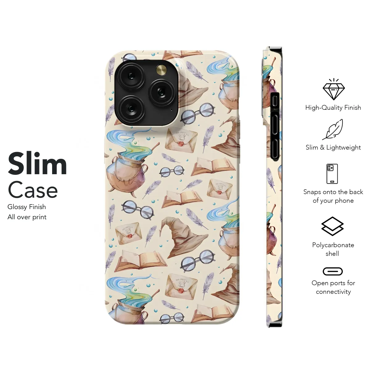 Embrace enchantment with this magical design, featuring whimsical cauldrons bubbling with vibrant potions, pointy witch hats, ancient spell books, and mysterious letters sealed with wax. This enchanting pattern is perfect for adding a touch of fantasy to your everyday life. The charming watercolor style gives it a handcrafted feel, making each piece unique. Express your inner wizard or witch with this delightful accessory. The intricate details and soft color palette create a captivating design that whispers tales of magic and wonder. Let this design be a portal to a world of spells and secrets, transforming your personal item into a mystical keepsake. This captivating print is sure to turn heads and spark conversations wherever you go. It's the perfect blend of whimsical artistry and everyday practicality, making it a truly enchanting choice. Order yours today and let the magic begin!